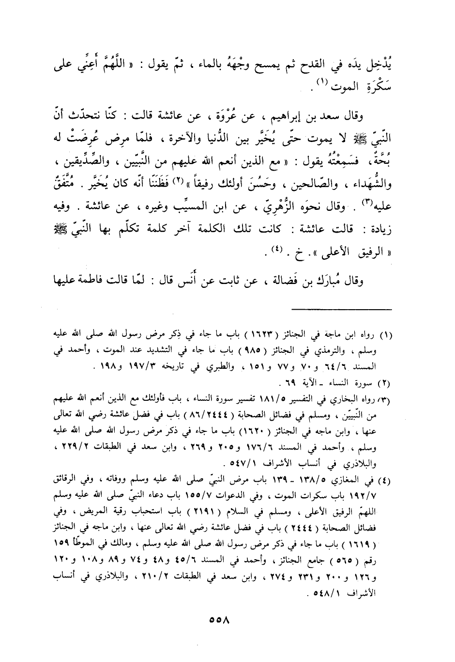 فَخَرَجَتْ سَرِيعًا، حَتَّى إِذَا هَبَطَتْ بِهِ الأَبْطَحَ، لَقِيَتْهَا الْخَيْلُ، وَفِي عُنُقِهَا طَوْقٌ لَهَا مِنْ وَرِقٍ، فَاقْتَطَعَهُ إِنْسَانٌ مِنْ عُنُقِهَا. فَلَمَّا دَخَلَ رَسُولُ اللَّهِ صَلَّى اللَّهُ عَلَيْهِ وَسَلَّم المسجد، خرج أبو بكر حتى جاء بأبيه يقوده. فلما رآه رَسُولِ اللَّهِ صَلَّى اللَّهُ عَلَيْهِ وَسَلَّمَ قَالَ: «هَلا تَرَكْتَ الشَّيْخَ فِي بَيْتِهِ حَتَّى أَجِيئَهُ» ؟ فَقَالَ: يَمْشِي هُوَ إِلَيْكَ يَا رَسُولَ اللَّهِ أَحَقَّ مِنْ أَنْ تَمْشِيَ إِلَيْهِ. فَأَجْلَسَهُ بَيْنَ يَدَيْهِ ثُمَّ مَسَحَ صَدْرَهُ وَقَالَ: «أَسْلِمْ تَسْلَمْ» . فَأَسْلَمَ.