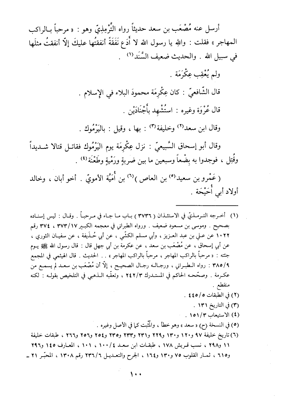 [6] تاريخ خليفة 97 و 120 و 130 و 229 و 231 و 233 و 235 و 254 و 256 و 266، طبقات خليفة 11 و 298، نسب قريش 178، طبقات ابن سعد 4/ 100، 101، المعارف 145 و 296 و 615، ثمار القلوب 75 و 130 و 164، الجرح والتعديل 6/ 236 رقم 1308، المحبّر 21