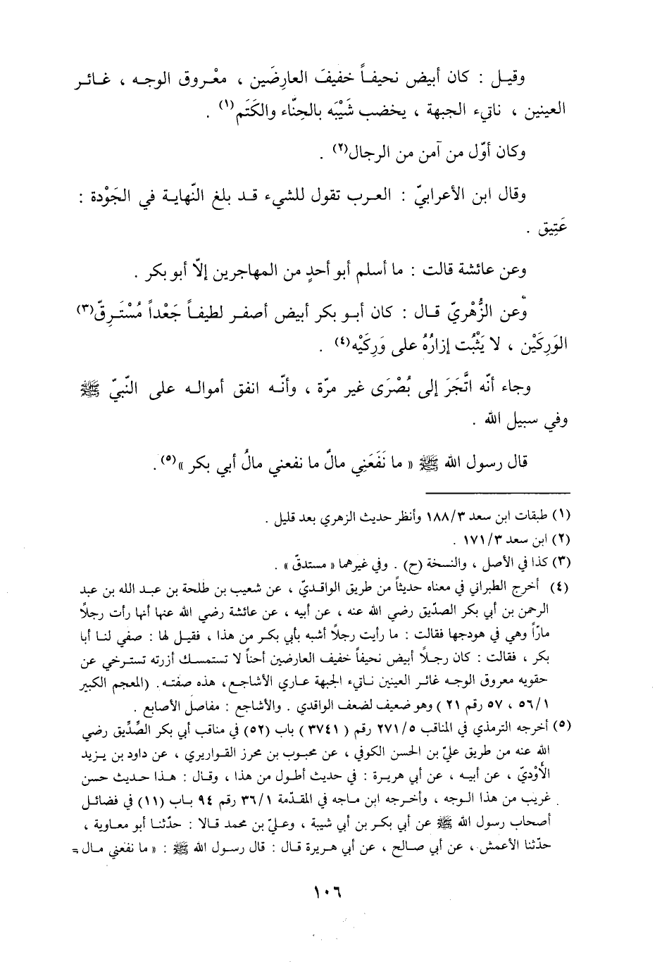 [4] أخرج الطبراني في معناه حديثا من طريق الواقديّ، عن شعيب بن طلْحة بْنِ عَبْدِ اللَّهِ بْنِ عَبْدِ الرَّحْمَنِ بْنِ أبي بكر الصديق رضي الله عنه، عَنْ أَبِيهِ، عَنْ عَائِشَةَ رَضِيَ اللَّهُ عَنْهَا أنها رأت رجلا مارّا وهي في هودجها فقالت: ما رأيت رجلا أشبه بأبي بكر من هذا، فقيل لها: صفي لنا أبا بكر، فقالت: كان رجلا أبيض نحيفا خفيف العارضين أحنى لا تستمسك أزرته تسترخي عن حقويه معروق الوجه غائر العينين ناتئ الجبهة عاري الأشاجع، هذه صفته. (المعجم الكبير 1/ 56، 57 رقم 21) وهو ضعيف لضعف الواقدي. والأشاجع: مفاصل الأصابع.
