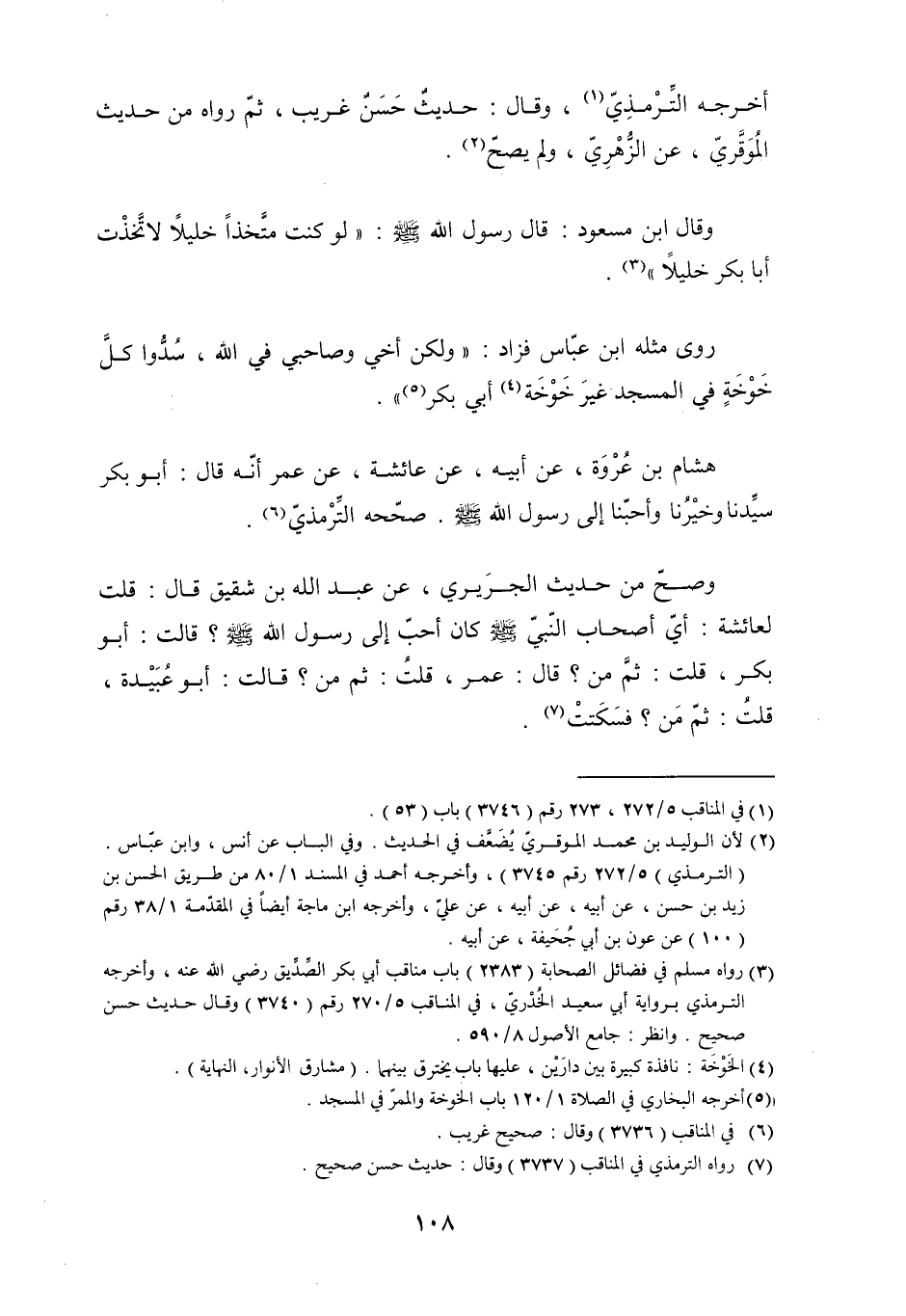 وقال ابن مسعود: قَالَ رَسُولُ اللَّهِ صَلَّى اللَّهُ عَلَيْهِ وَسَلَّمَ: «لَوْ كُنْتُ مُتَّخِذًا خَلِيلًا لَاتَّخَذْتُ أَبَا بَكْرٍ خَلِيلًا» [3] . رَوَى مِثْلَهُ ابْنُ عَبَّاسٍ فَزَادَ: «وَلَكِنْ أخي وصاحبي في اللَّهِ، سُدُّوا كُلَّ خَوْخَةٍ فِي الْمَسْجِدِ غَيْرَ خَوْخَةِ [4] أَبِي بَكْرٍ [5] » . هِشَامُ بْنُ عُرْوَةَ، عَنْ أَبِيهِ، عَنْ عَائِشَةَ، عَنْ عُمَرَ أَنَّهُ قَالَ: أبو بكر سيّدنا وخيرنا وَأَحَبُّنَا إِلَى رَسُولِ اللَّهِ صَلَّى اللَّهُ عَلَيْهِ وَسَلَّمَ. صَحَّحَهُ التِّرْمِذِيُّ [6] .