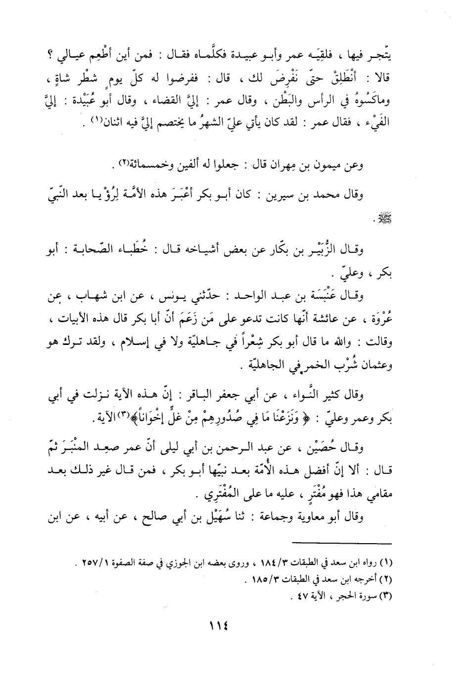 وَقَالَ كثير النَّواء، عَنْ أبي جعفر الباقر: إنّ هذه الآية نزلت في أبي بكر وعمر وعلي: وَنَزَعْنا مَا في صُدُورِهِمْ من غِلٍّ إِخْواناً 15: 47 [3] الآية. وَقَالَ حُصَيْن، عَنْ عبد الرحمن بْن أبي ليلى أن عُمَر صعِد المنْبَرَ ثُمَّ قَالَ: ألا إنّ أفضل هذه الأمة بعد نبيها أَبُو بكر، فمن قَالَ غير ذلك بعد مقامي هذا فهو مُفْتَرٍ، عليه مَا على الْمُفْتَرِي.