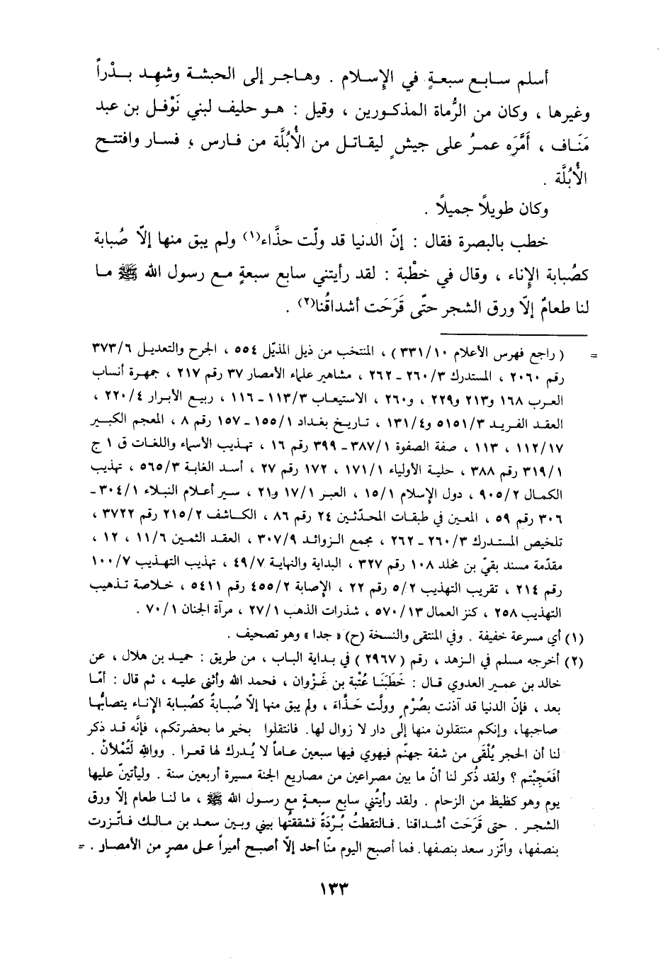 [ () ] (راجع فهرس الأعلام 10/ 331) ، المنتخب من ذيل المذيّل 554، الجرح والتعديل 6/ 373 رقم 2060، المستدرك 3/ 260- 262، مشاهير علماء الأمصار 37 رقم 217، جمهرة أنساب العرب 168 و 213 و 229، و 260، الاستيعاب 3/ 113- 116، ربيع الأبرار 4/ 220، العقد الفريد 3/ 5151 و 4/ 131، تاريخ بغداد 1/ 155- 157 رقم 8، المعجم الكبير 17/ 112، 113، صفة الصفوة 1/ 387- 399 رقم 16، تهذيب الأسماء واللغات ق 1 ج 1/ 319 رقم 388، حلية الأولياء 1/ 171، 172 رقم 27، أسد الغابة 3/ 565، تهذيب الكمال 2/ 905، دول الإسلام 1/ 15، العبر 1/ 17 و 21، سير أعلام النبلاء 1/ 304- 306 رقم 59، المعين في طبقات المحدّثين 24 رقم 86، الكاشف 2/ 215 رقم 3722، تلخيص المستدرك 3/ 260- 262، مجمع الزوائد 9/ 307، العقد الثمين 6/ 11، 12، مقدّمة مسند بقيّ بن مخلد 108 رقم 327، البداية والنهاية 7/ 49، تهذيب التهذيب 7/ 100 رقم 214، تقريب التهذيب 2/ 5 رقم 22، الإصابة 2/ 455 رقم 5411، خلاصة تذهيب التهذيب 258، كنز العمال 13/ 570، شذرات الذهب 1/ 27، مرآة الجنان 1/ 70.