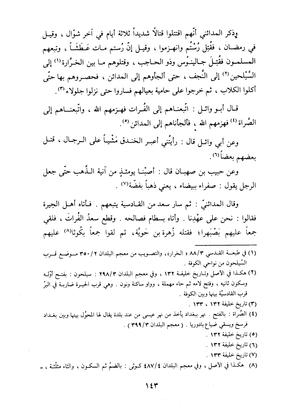 وَقَالَ المدائني: ثُمَّ سار سعد من القادسية يتبعهم. فأتاه أهل الحيرة فقالوا: نحن على عهدنا. وأتاه بسطام فصالحه. وقطع سعدُ الفرات، فلقي جمعًا عليهم بَصْبَهرا، فقتله زُهرة بْن حويَّة، ثُمَّ لقوا جمعًا بكُوثا [8] عليهم
