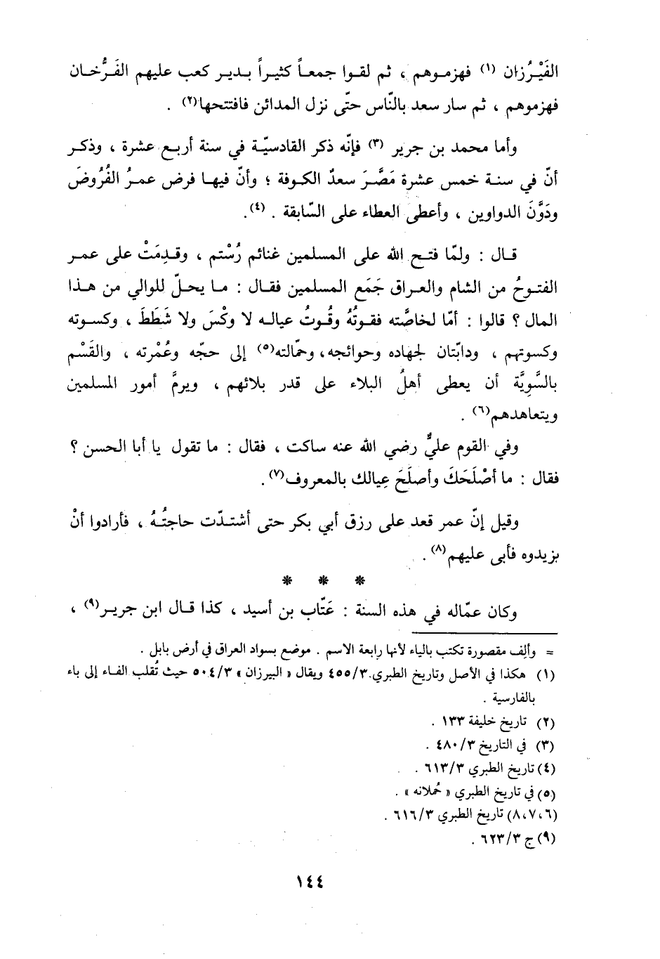 وأما محمد بْن جرير [3] فإنه ذكر القادسية في سنة أربع عشرة، وذكر أن في سنة خمس عشرة مَصَّر سعد الكوفة، وأنّ فيها فرض عمر الفروض وَدَوَّنَ الدواوين، وأعطى العطاء على السابقة. [4] قَالَ: ولمّا فتح الله على المُسْلِمين غنائم رستم، وقدمت على عُمَر الفتوح من الشام والعراق جمع المُسْلِمين فَقَالَ: مَا يحلّ لِلْوَالِي من هذا المال؟ قالوا: أما لخاصَّته فقوتُهُ وَقُوتُ عياله لَا وَكْسَ ولا شَطَطَ، وكسوته وكسوتهم، ودابتان لجهاده وحوائجه، وحمّالته [5] إلى حجه وعمرته، والقسم بالسوية أن يعطى أهل البلاء على قدر بلائهم، ويرمَّ أمور المُسْلِمين ويتعاهدهم [6] .