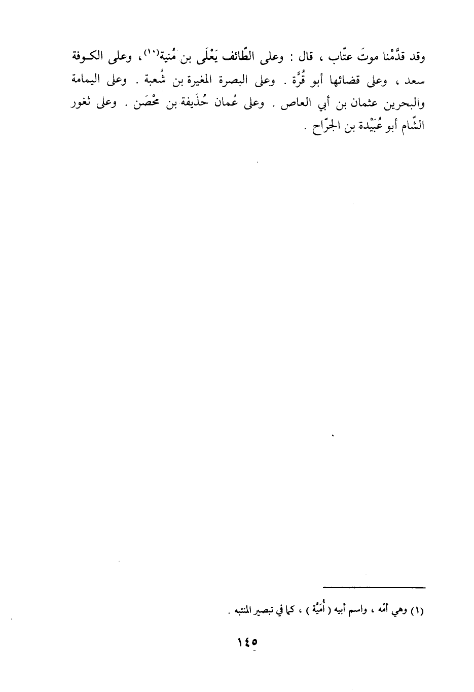 وقد قدمنا موت عتاب، قَالَ: وعلى الطائف يَعْلَى بْن مُنية [1] ، وعلى الكوفة سعد، وعلى قضائها أَبُو قُرَّةَ. وعلى البصرة المُغِيرَة بْن شُعْبَة. وعلى اليمامة والبحرين عثمان بْن أبي العاص. وعلى عمان حذيفة بن محصن. وعلى ثغور الشّام أبو عبيدة بن الجرّاح.