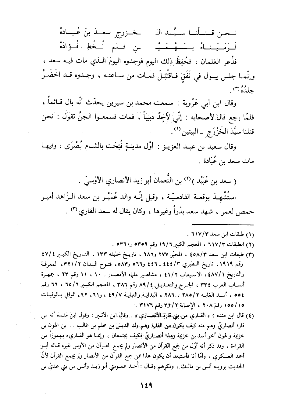 وَقَالَ ابن أبي عَرُوبة: سمعت محمد بْن سيرين يحدث أنه بال قائمًا، فلما رجع قَالَ لأصحابه: إني لأجد دبيبًا، فمات فسمعوا الجنَّ تقول: نحن قتلنا سيد الخزرجِ- البيتين [2] .