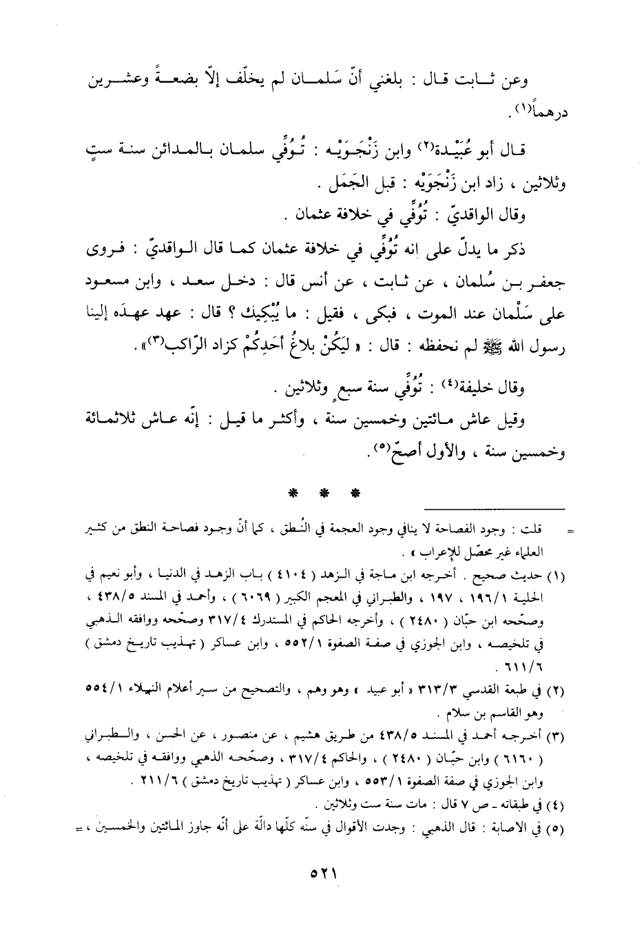 [5] في الاصابة: قال الذهبي: وجدت الأقوال في سنّة كلّها دالّة على أنّه جاوز المائتين والخمسين،