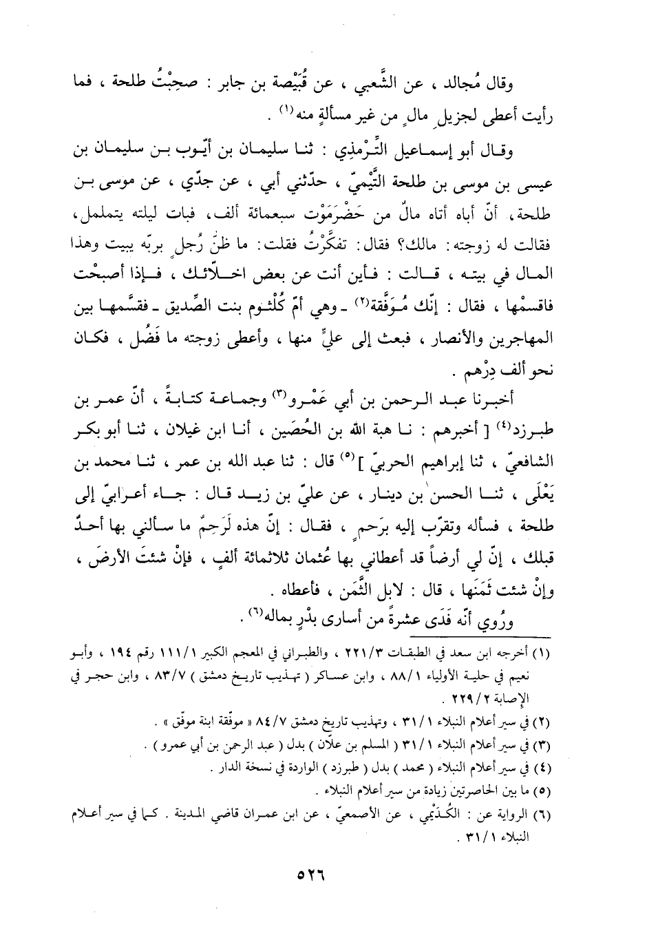 أَخْبَرَنَا عَبْدُ الرَّحْمَنِ بْنُ أَبِي عَمْرٍو [3] وَجَمَاعَةٌ كِتَابَةً، أَنَّ عُمَرَ بْنَ طَبَرْزَدَ [4] [أَخْبَرَهُمْ: نا هِبَةُ اللَّهِ بْنُ الْحُصَيْنِ، أنا ابْنُ غَيْلانَ، ثنا أَبُو بَكْرٍ الشَّافِعِيُّ، ثنا إِبْرَاهِيمُ الْحَرْبِيُّ] [5] قَالَ: ثنا عَبْدُ اللَّهِ بْنُ عُمَرَ، ثنا مُحَمَّدُ بْنُ يَعْلَى، ثنا الْحَسَنُ بْنُ دِينَارٍ، عَنْ عَلِيِّ بْنِ زَيْدٍ قَالَ: جَاءَ أَعْرَابِيٌّ إِلَى طَلْحَةَ، فَسَأَلَهُ وَتَقَرَّبَ إليه برحم، فقال: إنّ هذه لَرَحِمٌ مَا سَأَلَنِي بِهَا أَحَدٌ قَبْلَكَ، إِنَّ لِي أَرْضًا قَدْ أَعْطَانِي بِهَا عُثْمَانُ ثَلاثَمِائَةِ أَلْفٍ، فَإِنْ شِئْتَ الأَرْضَ، وَإِنْ شِئْتَ ثَمَنَهَا، قَالَ: لا بَلِ الثَّمَنَ، فَأَعْطَاهُ.