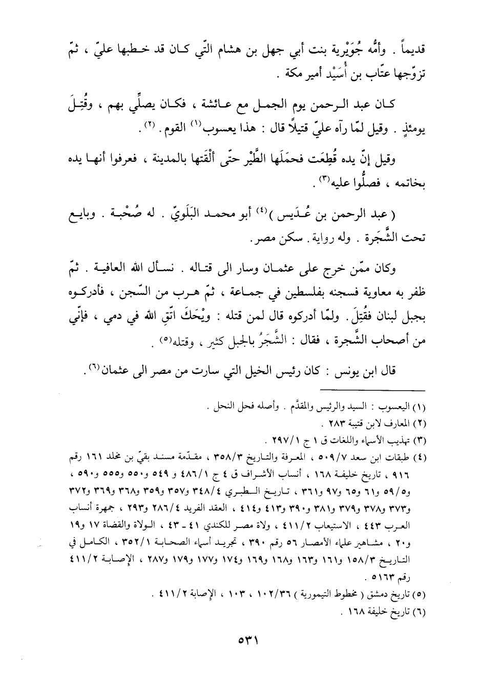 وكان ممن خرج على عثمان وسار إلى قتاله. نسأل الله العافية. ثمّ ظفر به معاوية فسجنه بفلسطين في جماعة، ثمّ هرب من السّجن، فأدركوه بجبل لبنان فقُتِلَ. ولمّا أدركوه قَالَ لمن قتله: وَيْحَكَ اتّقِ الله في دمي، فإنّي من أصحاب الشَّجرة، فَقَالَ: الشَّجَرُ بالجبل كثير، وقتله [5] .
