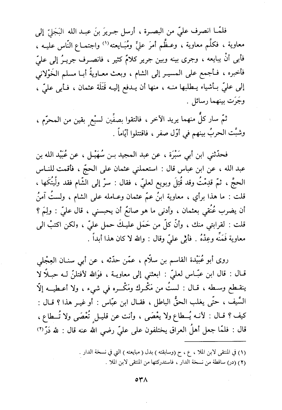 قُلْتُ: لِقَرَابَتِي مِنْكَ، وَأَنَّ كُلَّ مَنْ حَمَلَ عَلَيْكَ حَمَلَ عَلَيَّ، وَلَكِنِ اكْتُبْ إِلَى مُعَاوِيَةَ فَمُنَّهُ وَعِدْهُ. فَأَبَى عَلِيٌّ وَقَالَ: وَاللَّهِ لا كَانَ هَذَا أَبَدًا. رَوَى أَبُو عُبَيْدَةَ الْقَاسِمُ بْنُ سَلامٍ، عَمَّنْ حَدَّثَهُ، عَنْ أَبِي سِنَانٍ الْعِجْلِيِّ قَالَ: قَالَ ابْنُ عَبَّاسٍ لعليّ: ابعثني إلى معاوية، فو الله لأَفْتِلَنَّ لَهُ حَبْلا لا يَنْقَطِعُ وَسَطُهُ، قَالَ: لَسْتُ مِنْ مَكْرِكَ وَمَكْرِهِ فِي شَيْءٍ، وَلا أَعْطِيهِ إِلا السَّيْفَ، حَتَّى يَغْلِبَ الْحَقُّ الْبَاطِلَ، فَقَالَ ابْنُ عَبَّاسٍ: أَوْ غَيْرُ هَذَا؟ قَالَ: