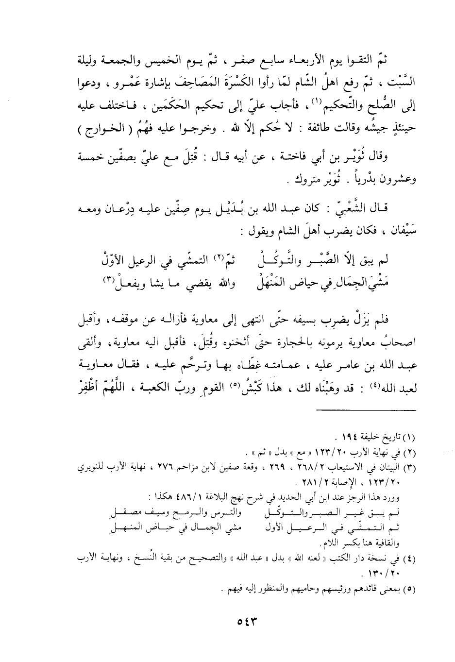 ثُمَّ التقوا يوم الأربعاء سابع صفر، ثُمَّ يوم الخميس والجمعة وليلة السَّبْت، ثُمَّ رفع أَهْل الشام لمّا رأوا الكَسْرَة الْمَصَاحِفَ بإشارة عمرو، ودعوا إِلَى الصُّلح والتّحكيم [1] ، فأجاب عليّ إلى تحكيم الحَكَمين، فاختلف عليه حينئذ جيشه وقالت طائفة: لَا حُكم إلّا للَّه. وخرجوا عليه فهُمُ (الخوارج) وقال ثُوَيْر بْن أبي فاختة، عن أَبِيهِ قَالَ: قُتِلَ مع عليّ بصفين خمسة وعشرون بدْريًا. ثُوَيْر متروك.