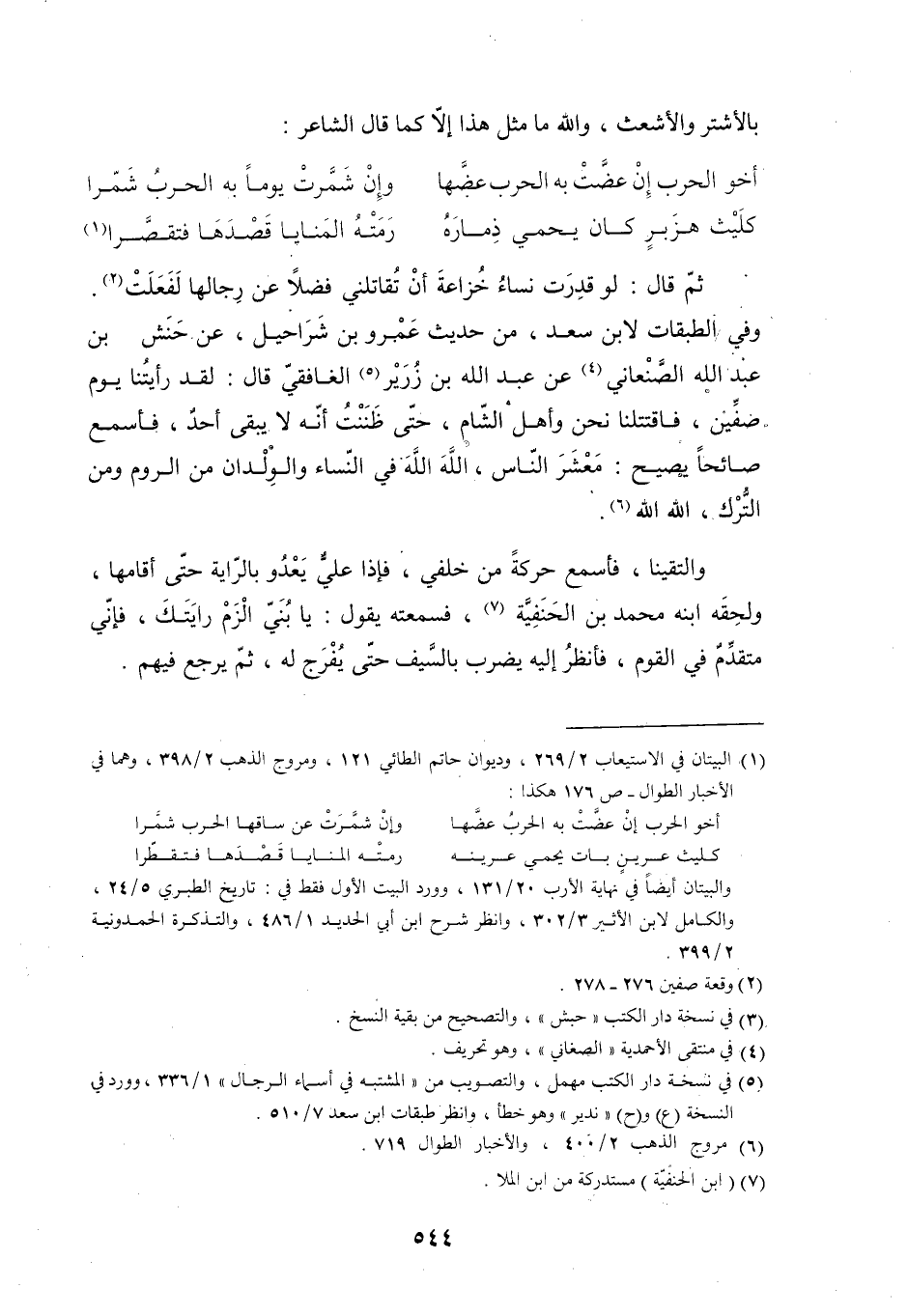 وَفِي الطبقات لابن سعد، من حديث عمرو بْن شَرَاحيل، عن حَنَش [3] بْن عَبْد الله الصَّنْعاني [4] عن عَبْد الله بْن زُرَيْر [5] الغافقي قَالَ: لقد رأيتنا يوم صفِّين، فاقتتلنا نحن وأهل الشّام، حتّى ظننت أنّه لَا يبقى أحدٌ، فأسمع صائحًا يصيح: مَعْشَرَ النّاس، اللَّه اللَّه فِي النساء والوِلدان من الروم ومن الترك، الله الله [6] .