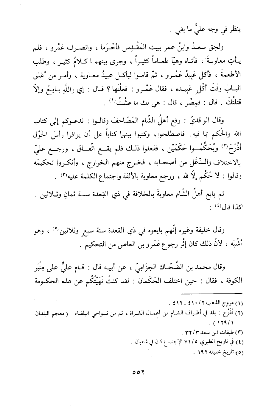 وقال الواقدي: رفع أَهْل الشام المصاحف وقالوا: ندعوكم إلى كتاب الله والحكم بما فِيهِ. فاصطلحوا، وكتبوا بينهما كتابًا على أن يوافوا رأسَ الْحَوْلِ أذْرُحَ [2] ويُحَكِّمُوا حَكَمَيْن، ففعلوا ذلك فلم يقع اتّفاق، ورجع عليّ بالاختلاف والدّغّل من أصحابه، فخرج منهم الخوارج، وأنكروا تحكيمه وقالوا: لَا حُكْم إلّا للَّه، ورجع مُعَاوِيَة بالألفة واجتماع الكلمة عليه [3] .