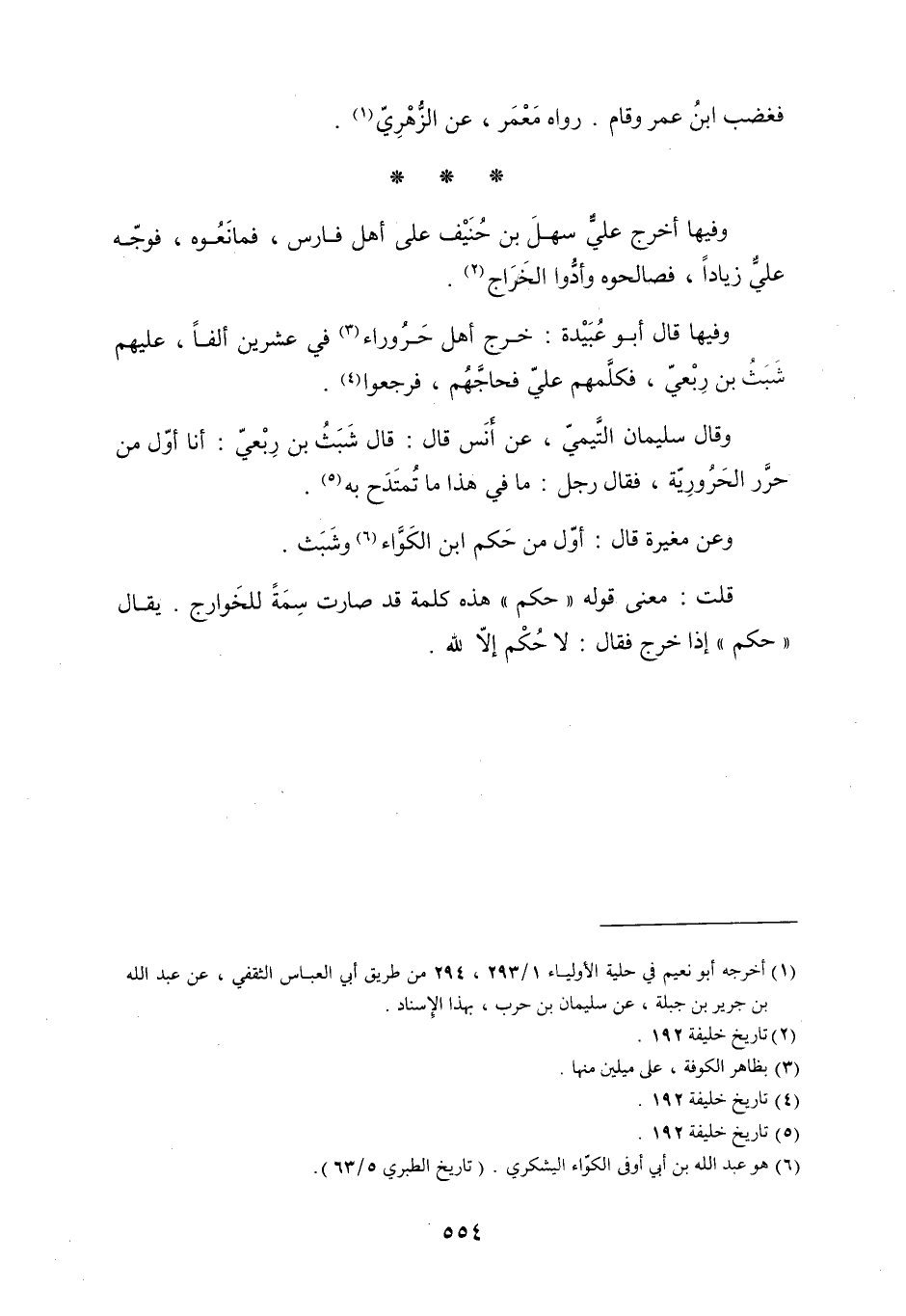 وفيها قال أَبُو عبيدة: خرج أَهْل حَرُوراء [3] فِي عشرين ألفًا، عليهم شَبَثُ بْن رِبْعيّ، فكَّلمهم عليّ فحاجَّهُم، فرجعوا [4] .