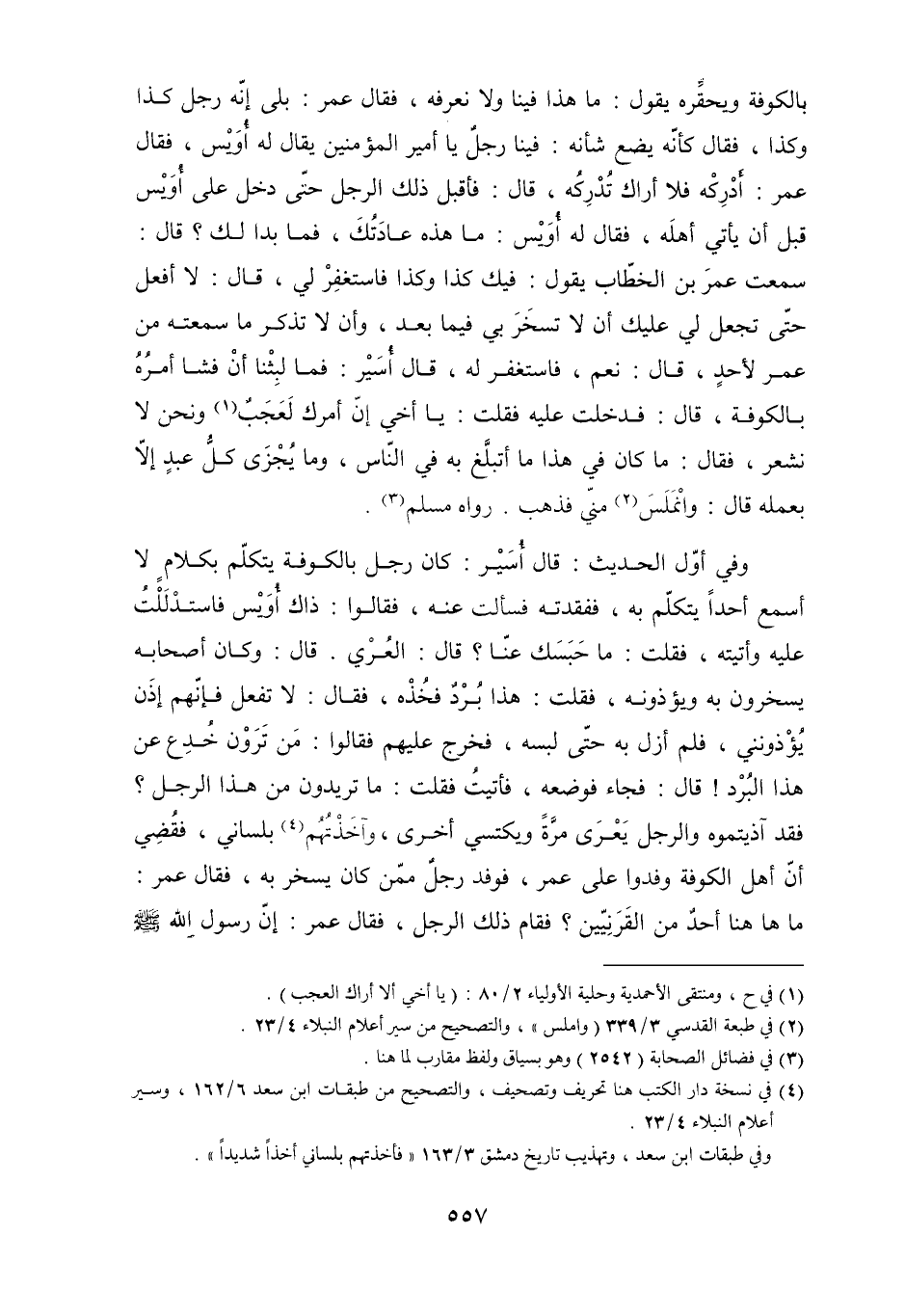 سمعت عُمَر بْن الخطاب يقول: فيك كذا وكذا فاستغفر لي، قَالَ: لَا أفعل حتّى تجعل لي عليك أن لَا تسخر بْي فيما بعد، وأن لَا تذكر مَا سمعته من عُمَر لأحدٍ، قَالَ: نعم، فاستغفر له، قَالَ أُسَيْر: فَمَا لبِثْنا أنْ فشا أمرُهُ بالكوفة، قَالَ: فدخلت عليه فَقُلْتُ: يا أخي إنّ أمرك لَعَجَبٌ [1] ونحن لَا نشعر، فقال: ما كان فِي هَذَا مَا أتبلَّغ به فِي النّاس، وما يُجْزَى كلُّ عبدٍ إلّا بعمله قال: وانملس [2] منّي فذهب. رواه مسلم [3] .