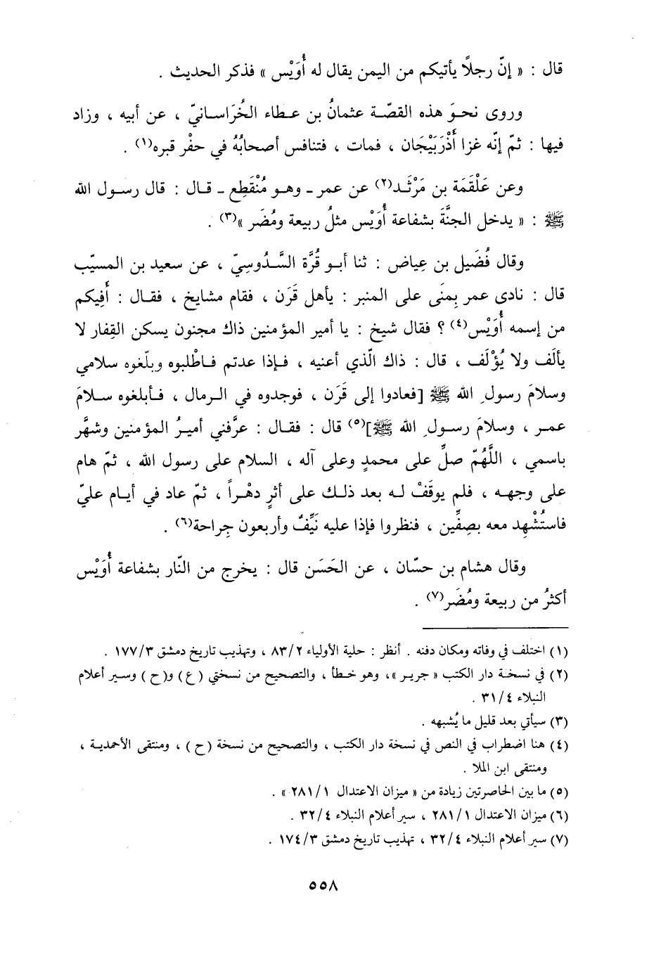 وَعَنْ عَلْقَمَةَ بْنِ مَرْثَدٍ [2] عَنْ عُمَرَ- وَهُوَ مُنْقَطِعٌ- قَالَ: قَالَ رَسُولُ اللَّهِ صَلَّى اللَّهُ عَلَيْهِ وسلم: «يَدْخُلُ الْجَنَّةَ بِشَفَاعَةِ أُوَيْسٍ مِثْلُ رَبِيعَةَ وَمُضَرَ» [3] . وَقَالَ فُضَيْلُ بْنُ عِيَاضٍ: ثنا أَبُو قُرَّةَ السَّدُوسِيُّ، عَنْ سَعِيدِ بْنِ الْمُسَيِّبِ قَالَ: نَادَى عُمَرُ بِمِنًى عَلَى الْمِنْبَرِ: يَا أَهْلَ قَرَنٍ، فَقَامَ مَشَايِخُ، فَقَالَ: أَفِيكُمْ مَنِ اسْمُهُ أُوَيْسٌ [4] ؟ فَقَالَ شَيْخٌ: يَا أَمِيرَ الْمُؤْمِنِينَ ذَاكَ مَجْنُونٌ يسكن القفار لا يَأْلَفُ وَلا يُؤْلَفُ، قَالَ: ذَاكَ الَّذِي أَعْنِيهِ، فَإِذَا عُدْتُمْ فَاطْلُبُوهُ وَبَلِّغُوهُ سَلامِي وَسَلامَ رسول الله صلى الله عليه وسلّم [فعادوا إِلَى قَرَنٍ، فَوَجَدُوهُ فِي الرِّمَالِ، فَأَبْلَغُوهُ سَلامَ عُمَرَ، وَسَلامَ رَسُولِ اللَّهِ صَلَّى اللَّهُ عَلَيْهِ وَسَلَّمَ] [5] قَالَ: فَقَالَ: عَرَّفَنِي أَمِيرُ الْمُؤْمِنِينَ وَشَهَّرَ باسمي، اللَّهمّ صلّ عَلَى مُحَمَّدٍ وَعَلَى آلِهِ، السَّلامُ عَلَى رَسُولِ اللَّهِ، ثُمَّ هَامَ عَلَى وَجْهِهِ، فَلَمْ يُوقَفْ لَهُ بَعْدَ ذَلِكَ عَلَى أَثَرٍ دَهْرًا، ثُمَّ عَادَ فِي أَيَّامِ عَلِيٍّ فَاسْتُشْهِدَ مَعَهُ بِصِفِّينَ، فَنَظَرُوا فَإِذَا عَلَيْه نَيِّفٌ وَأَرْبَعُونَ جِرَاحَةً [6] .
