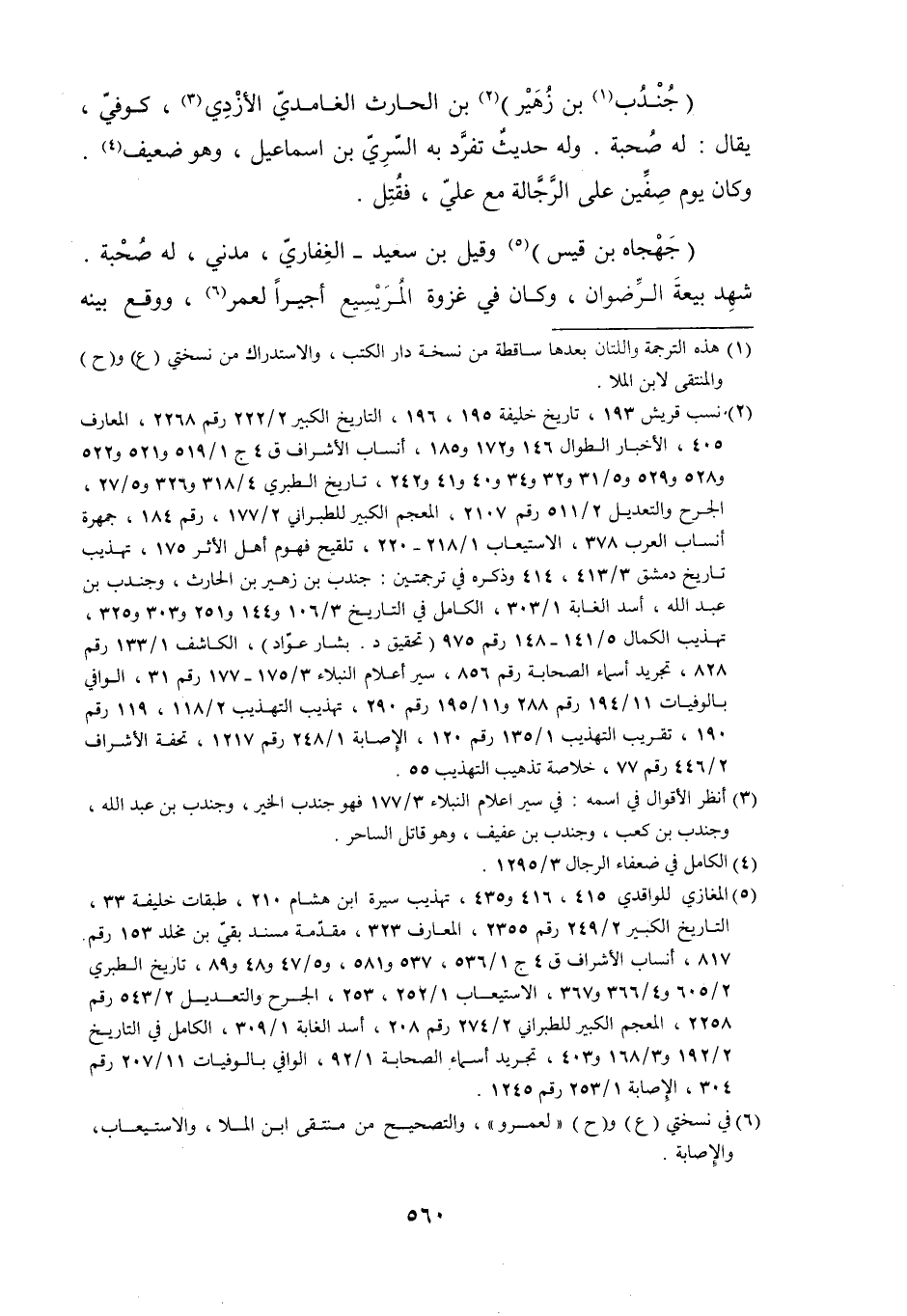 [2] نسب قريش 193، تاريخ خليفة 195، 196، التاريخ الكبير 2/ 222 رقم 2268، المعارف 405، الأخبار الطوال 146 و 172 و 185، أنساب الأشراف ق 4 ج 1/ 519 و 521 و 522 و 528 و 529 و 5/ 31 و 32 و 34 و 40 و 41 و 242، تاريخ الطبري 4/ 318 و 326 و 5/ 27، الجرح والتعديل 2/ 511 رقم 2107، المعجم الكبير للطبراني 2/ 177، رقم 184، جمهرة أنساب العرب 378، الاستيعاب 1/ 218- 220، تلقيح فهوم أهل الأثر 175، تهذيب تاريخ دمشق 3/ 413، 414 وذكره في ترجمتين: جندب بن زهير بن الحارث، وجندب بن عبد الله، أسد الغابة 1/ 303، الكامل في التاريخ 3/ 106 و 144 و 251 و 303 و 325، تهذيب الكمال 5/ 141- 148 رقم 975 (تحقيق د. بشار عوّاد) ، الكاشف 1/ 133 رقم 828، تجريد أسماء الصحابة رقم 856، سير أعلام النبلاء 3/ 175- 177 رقم 31، الوافي بالوفيات 11/ 194 رقم 288 و 11/ 195 رقم 290، تهذيب التهذيب 2/ 118، 119 رقم 190، تقريب التهذيب 1/ 135 رقم 120، الإصابة 1/ 248 رقم 1217، تحفة الأشراف 2/ 446 رقم 77، خلاصة تذهيب التهذيب 55.