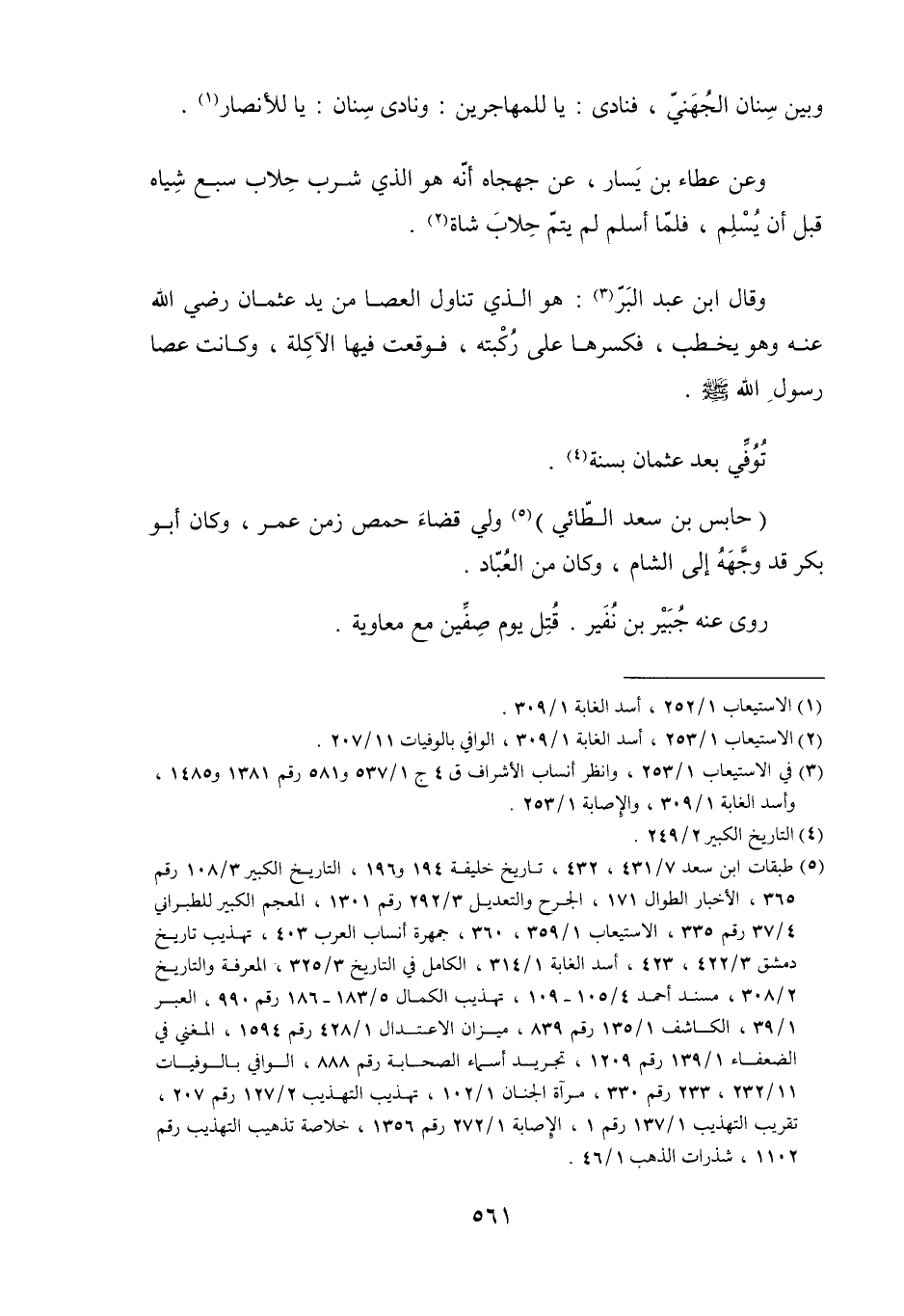 [3] في الاستيعاب 1/ 253، وانظر أنساب الأشراف ق 4 ج 1/ 537 و 581 رقم 1381 و 1485، وأسد الغابة 1/ 309، والإصابة 1/ 253.