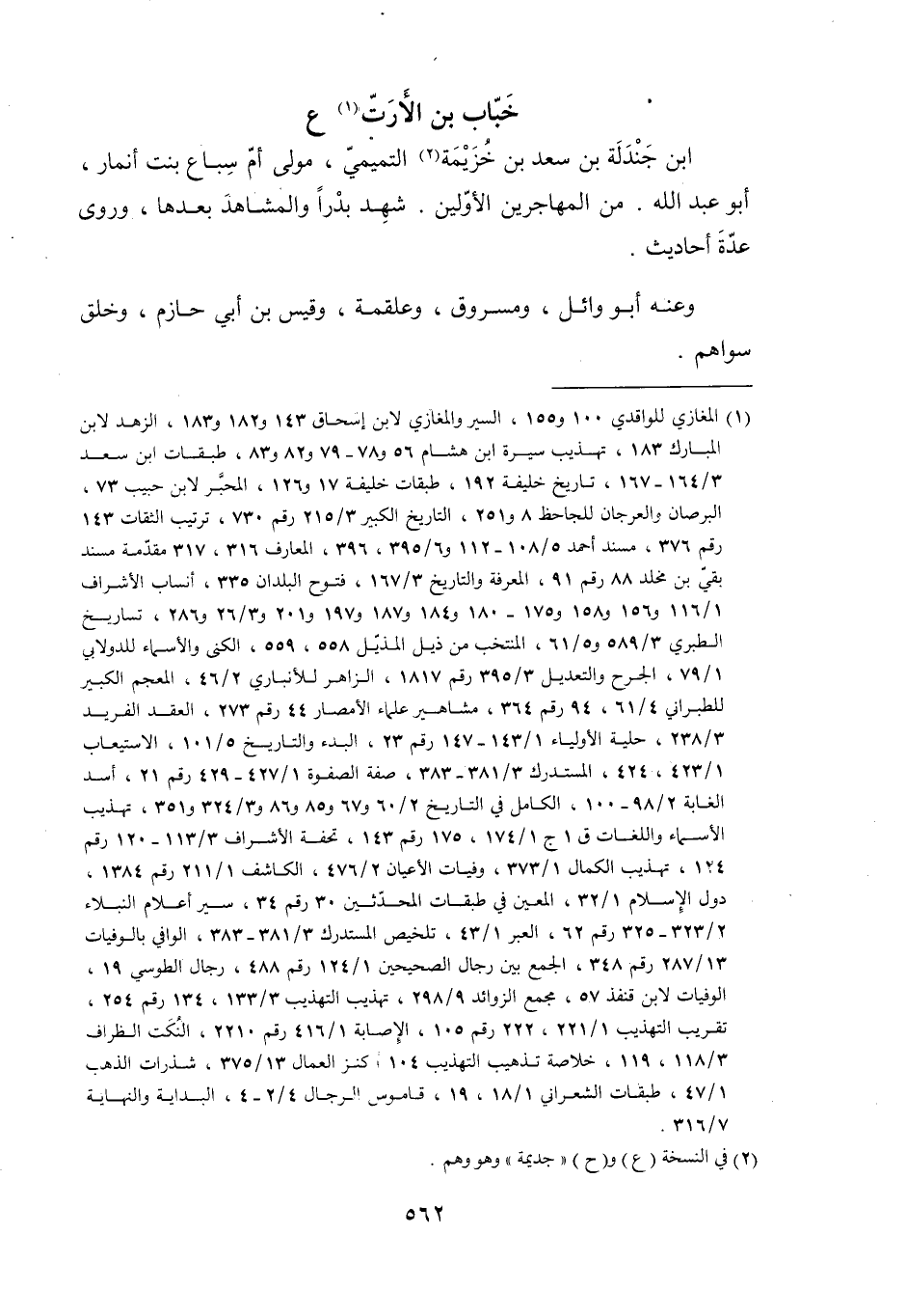 [1] المغازي للواقدي 100 و 155، السير والمغازي لابن إسحاق 143 و 182 و 183، الزهد لابن المبارك 183، تهذيب سيرة ابن هشام 56 و 78- 79 و 82 و 83، طبقات ابن سعد 3/ 164- 167، تاريخ خليفة 192، طبقات خليفة 17 و 126، المحبّر لابن حبيب 73، البرصان والعرجان للجاحظ 8 و 251، التاريخ الكبير 3/ 215 رقم 730، ترتيب الثقات 143 رقم 376، مسند أحمد 5/ 108- 112 و 6/ 395، 396، المعارف 316، 317 مقدّمة مسند بقيّ بن مخلد 88 رقم 91، المعرفة والتاريخ 3/ 167، فتوح البلدان 335، أنساب الأشراف 1/ 116 و 156 و 158 و 175- 180 و 184 و 187 و 197 و 201 و 3/ 26 و 286، تاريخ الطبري 3/ 589 و 5/ 61، المنتخب من ذيل المذيّل 558، 559، الكنى والأسماء للدولابي 1/ 79، الجرح والتعديل 3/ 395 رقم 1817، الزاهر للأنباري 2/ 46، المعجم الكبير للطبراني 4/ 61، 94 رقم 364، مشاهير علماء الأمصار 44 رقم 273، العقد الفريد 3/ 238، حلية الأولياء 1/ 143- 147 رقم 23، البدء والتاريخ 5/ 101، الاستيعاب 1/ 423، 424، المستدرك 3/ 381- 383، صفة الصفوة 1/ 427- 429 رقم 21، أسد الغابة 2/ 98- 100، الكامل في التاريخ 2/ 60 و 67 و 85 و 86 و 3/ 324 و 351، تهذيب الأسماء واللغات ق 1 ج 1/ 174، 175 رقم 143، تحفة الأشراف 3/ 113- 120 رقم 124، تهذيب الكمال 1/ 373، وفيات الأعيان 2/ 476، الكاشف 1/ 211 رقم 1384، دول الإسلام 1/ 32، المعين في طبقات المحدّثين 30 رقم 34، سير أعلام النبلاء 2/ 323- 325 رقم 62، العبر 1/ 43، تلخيص المستدرك 3/ 381- 383، الوافي بالوفيات 13/ 287 رقم 348، الجمع بين رجال الصحيحين 1/ 124 رقم 488، رجال الطوسي 19، الوفيات لابن قنفذ 57، مجمع الزوائد 9/ 298، تهذيب التهذيب 3/ 133، 134 رقم 254، تقريب التهذيب 1/ 221، 222 رقم 105، الإصابة 1/ 416 رقم 2210، النكت الظراف 3/ 118، 119، خلاصة تذهيب التهذيب 104/ كنز العمال 13/ 375، شذرات الذهب 1/ 47، طبقات الشعراني 1/ 18، 19، قاموس الرجال 4/ 2- 4، البداية والنهاية 7/ 316.