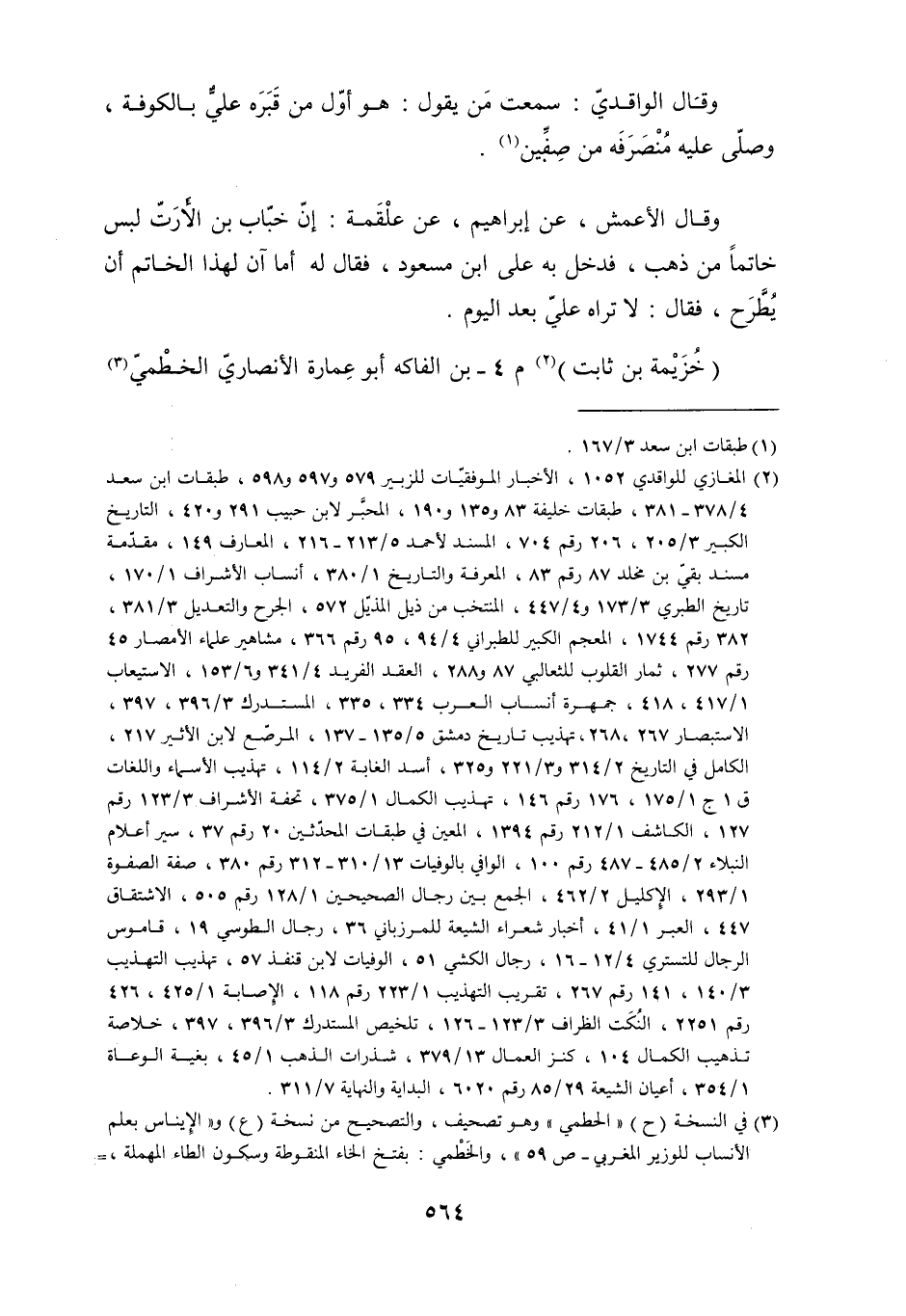 [2] المغازي للواقدي 1052، الأخبار الموفقيّات للزبير 579 و 597 و 598، طبقات ابن سعد 4/ 378- 381، طبقات خليفة 83 و 135 و 190، المحبّر لابن حبيب 291 و 420، التاريخ الكبير 3/ 205، 206 رقم 704، المسند لأحمد 5/ 213- 216، المعارف 149، مقدّمة مسند بقيّ بن مخلد 87 رقم 83، المعرفة والتاريخ 1/ 380، أنساب الأشراف 1/ 170، تاريخ الطبري 3/ 173 و 4/ 447، المنتخب من ذيل المذيّل 572، الجرح والتعديل 3/ 381، 382 رقم 1744، المعجم الكبير للطبراني 4/ 94، 95 رقم 366، مشاهير علماء الأمصار 45 رقم 277، ثمار القلوب للثعالبي 87 و 288، العقد الفريد 4/ 341 و 6/ 153، الاستيعاب 1/ 417، 418، جمهرة أنساب العرب 334، 335، المستدرك 3/ 396، 397، الاستبصار 267، 268، تهذيب تاريخ دمشق 5/ 135- 137، المرصّع لابن الأثير 217، الكامل في التاريخ 2/ 314 و 3/ 221 و 325، أسد الغابة 2/ 114، تهذيب الأسماء واللغات ق 1 ج 1/ 175، 176 رقم 146، تهذيب الكمال 1/ 375، تحفة الأشراف 3/ 123 رقم 127، الكاشف 1/ 212 رقم 1394، المعين في طبقات المحدّثين 20 رقم 37، سير أعلام النبلاء 2/ 485- 487 رقم 100، الوافي بالوفيات 13 310- 312 رقم 380، صفة الصفوة 1/ 293، الإكليل 2/ 462، الجمع بين رجال الصحيحين 1/ 128 رقم 505، الاشتقاق 447، العبر 1/ 41، أخبار شعراء الشيعة للمرزباني 36، رجال الطوسي 19، قاموس الرجال للتستري 4/ 12- 16، رجال الكشي 51، الوفيات لابن قنفذ 57، تهذيب التهذيب 3/ 140، 141 رقم 267، تقريب التهذيب 1/ 223 رقم 118، الإصابة 1/ 425، 426 رقم 2251، النكت الظراف 3/ 123- 126، تلخيص المستدرك 3/ 396، 397، خلاصة تذهيب الكمال 104، كنز العمال 13/ 379، شذرات الذهب 1/ 45، بغية الوعاة 1/ 354، أعيان الشيعة 29/ 85 رقم 6020، البداية والنهاية 7/ 311.