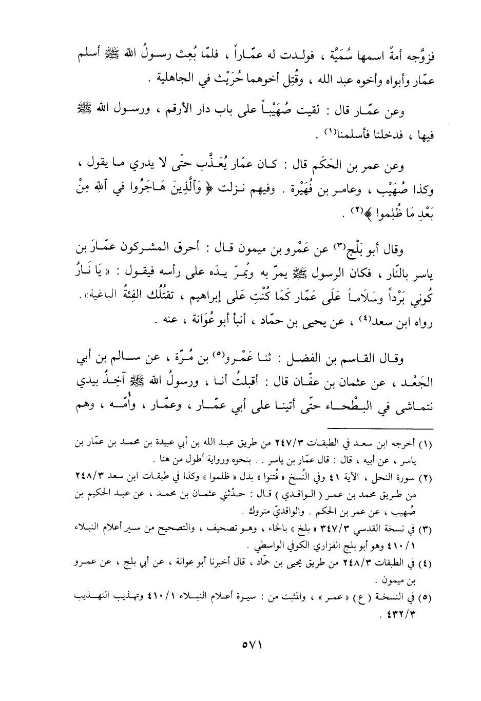 [1] أخرجه ابن سعد في الطبقات 3/ 247 من طريق عَبْدُ اللَّهِ بْنُ أَبِي عُبَيْدَةَ بْنِ مُحَمَّدِ بْنِ عَمَّارِ بْنِ ياسر، عن أبيه، قال: قال عمّار بن ياسر.. بنحوه ورواية أطول من هنا.