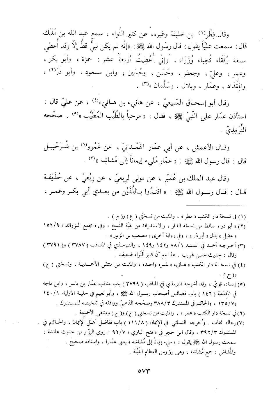 [3] أخرجه أحمد في المسند 1/ 88 و 142 و 149، والترمذي في المناقب (3787) و (3791) وقال: حديث حسن غريب. هذا مع أنّ كثير النّواء ضعيف.
