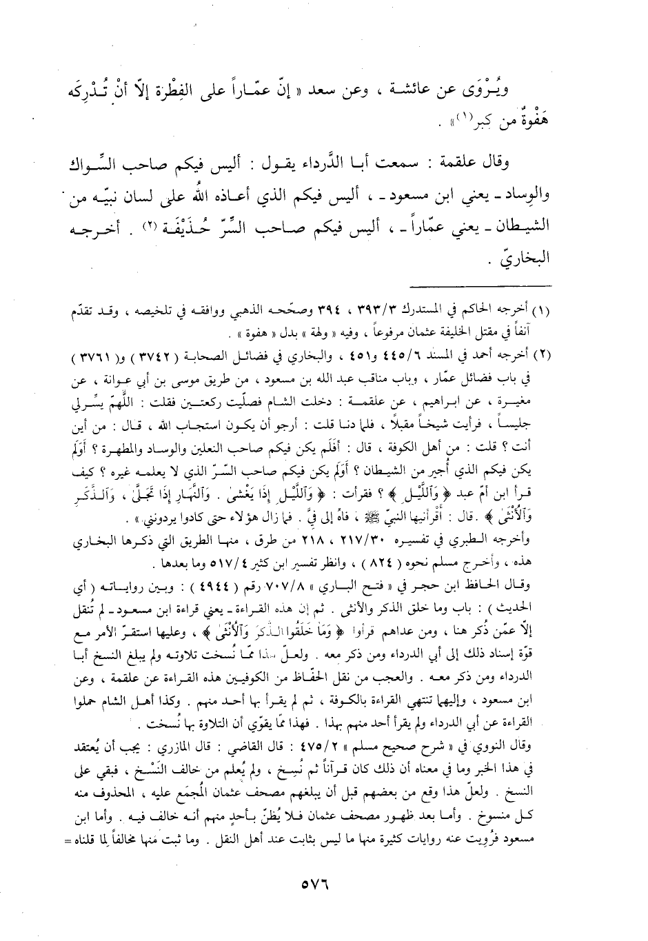 وقال النووي في «شرح صحيح مسلم» 2/ 475: قال القاضي: قال المازري: يجب أن يعتقد في هذا الخبر وما في معناه أن ذلك كان قرآنا ثم نسخ، ولم يعلم من خالف النسخ، فبقي على النسخ. ولعلّ هذا وقع من بعضهم قبل أن يبلغهم مصحف عثمان المجمع عليه، المحذوف منه كل منسوخ. وأما بعد ظهور مصحف عثمان فلا يظنّ بأحد منهم أنه خالف فيه. وأما ابن مسعود فرويت عنه روايات كثيرة منها ما ليس بثابت عند أهل النقل. وما ثبت منها مخالفا لما قلناه