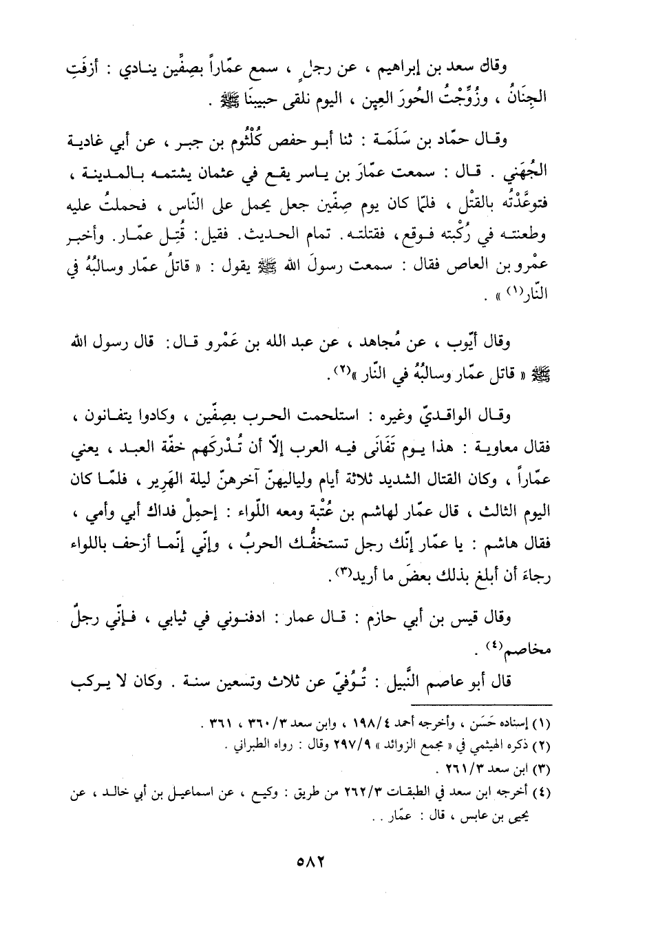 [4] أخرجه ابن سعد في الطبقات 3/ 262 من طريق: وكيع، عَنْ إسماعيل بْن أَبِي خَالِد، عَنْ يحيى بن عابس، قال: عمّار..