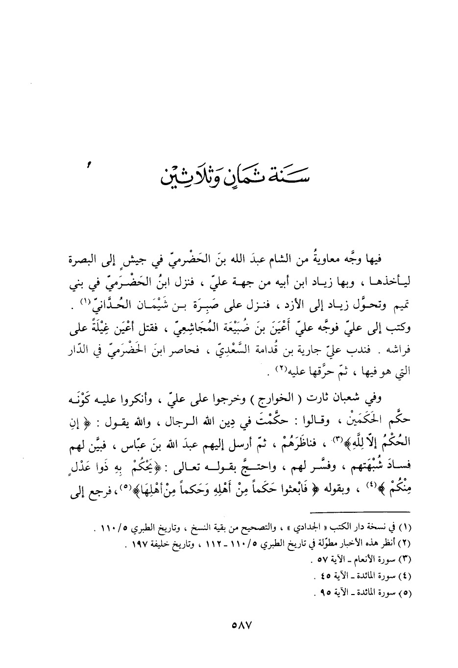 وَفِي شعبان ثارت (الخوارج) وخرجوا على عليّ، وأنكروا عليه كَوْنَه حكَّم الحَكَمين، وقالوا: حكَّمْتَ فِي دين الله الرجال، والله يقول: إِنِ الْحُكْمُ إِلَّا لِلَّهِ 6: 57 [3] ، فناظَرَهُمْ، ثُمَّ أرسل إليهم عَبْد الله بن عَبَّاس، فبيَّن لهم فسادَ شُبْهَتهم، وفسر لهم، واحتجَّ بقوله تعالى: يَحْكُمُ بِهِ ذَوا عَدْلٍ مِنْكُمْ 5: 95 [4] ، وبقوله فَابْعَثُوا حَكَماً مِنْ أَهْلِهِ وَحَكَماً مِنْ أَهْلِها 4: 35 [5] ، فرجع إلى