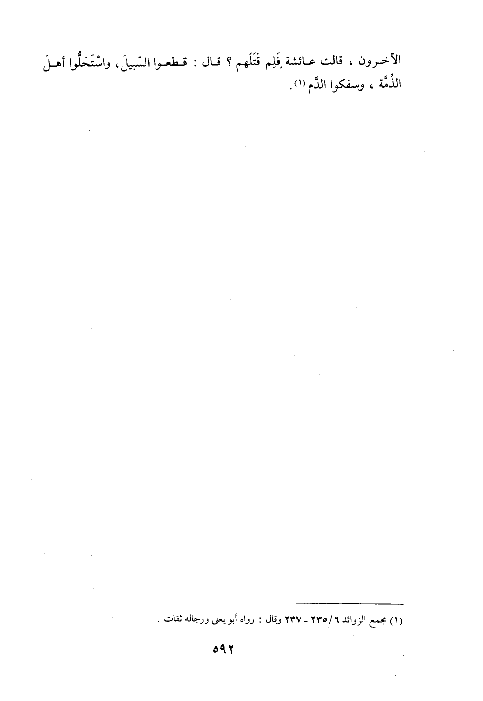 الآخَرُونَ، قَالَتْ عَائِشَةُ فَلِم قَتَلَهُمْ؟ قَالَ: قَطَعُوا السّبيل، واستحلّوا أهل الذّمّة، وسفكوا الدّم [1] .