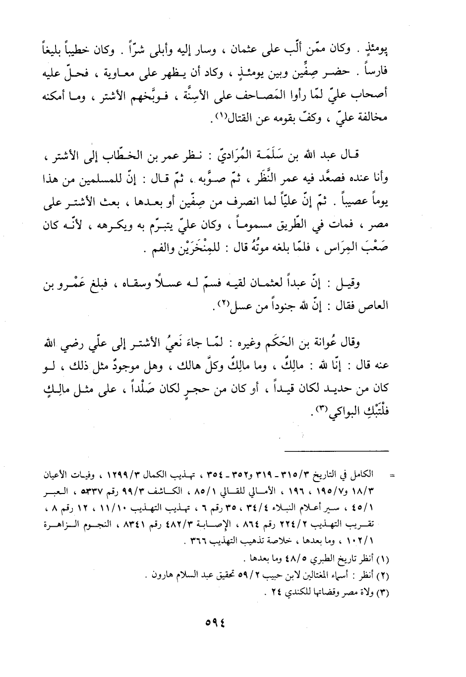 يومئذٍ. وكان ممّن ألّب على عُثْمَان، وسار إليه وأبلى شرًّا. وكان خطيبًا بليغًا فارسًا. حضر صِفِّين وبين يومئذٍ، وكاد أن يظهر على مُعَاوِيَة، فحلّ عليه أصحاب عليّ لما رأوا المصاحف على الأسِنَّة، فوبَّخهم الأشتر، وما أمكنه مخالفة عليّ، وكف بقومه عن القتال [1] .