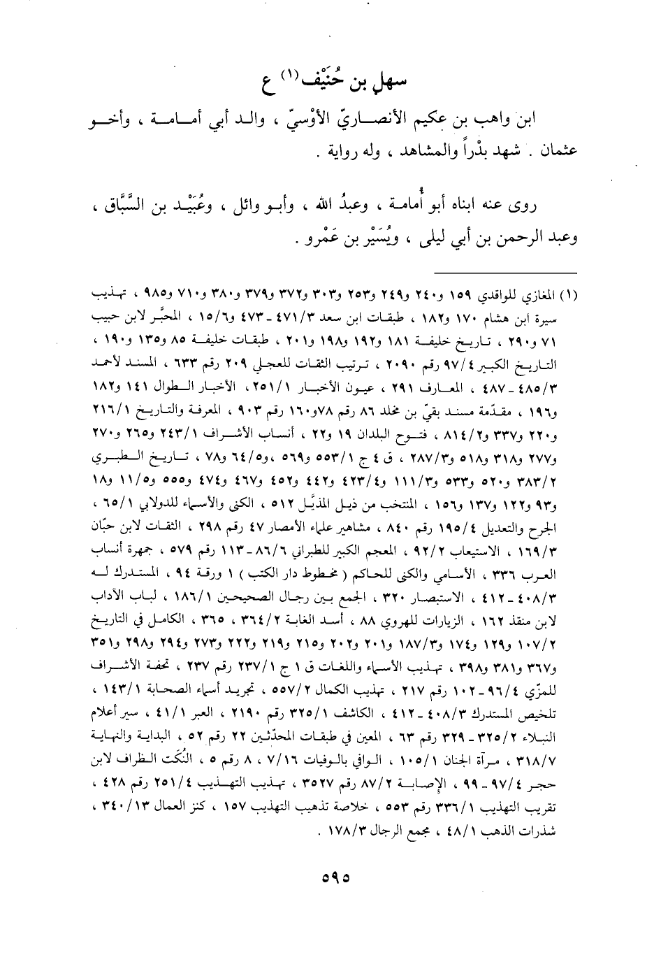 [1] المغازي للواقدي 159 و 240 و 249 و 253 و 303 و 372 و 379 و 380 و 710 و 985، تهذيب سيرة ابن هشام 170 و 182، طبقات ابن سعد 3/ 471- 473 و 6/ 15، المحبّر لابن حبيب 71 و 290، تاريخ خليفة 181 و 192 و 198 و 201، طبقات خليفة 85 و 135 و 190، التاريخ الكبير 4/ 97 رقم 2090، ترتيب الثقات للعجلي 209 رقم 633، المسند لأحمد 3/ 485- 487، المعارف 291، عيون الأخبار 1/ 251، الأخبار الطوال 141 و 182 و 196، مقدّمة مسند بقيّ بن مخلد 86 رقم 78 و 160 رقم 903، المعرفة والتاريخ 1/ 216 و 220 و 337 و 2/ 814، فتوح البلدان 19 و 22، أنساب الأشراف 1/ 243 و 265 و 270 و 277 و 318 و 518 و 3/ 287، ق 4 ج 1/ 553 و 569، و 5/ 64 و 78، تاريخ الطبري 2/ 383 و 520 و 533 و 3/ 111 و 4/ 423 و 442 و 452 و 467 و 474 و 555 و 5/ 11 و 18 و 93 و 122 و 137 و 156، المنتخب من ذيل المذيّل 512، الكنى والأسماء للدولابي 1/ 65، الجرح والتعديل 4/ 195 رقم 840، مشاهير علماء الأمصار 47 رقم 298، الثقات لابن حبّان 3/ 169، الاستيعاب 2/ 92، المعجم الكبير للطبراني 6/ 86- 113 رقم 579، جمهرة أنساب العرب 336، الأسامي والكنى للحاكم (مخطوط دار الكتب) 1 ورقة 94، المستدرك له 3/ 408- 412، الاستبصار 320، الجمع بين رجال الصحيحين 1/ 186، لباب الآداب لابن منقذ 162، الزيارات للهروي 88، أسد الغابة 2/ 364، 365، الكامل في التاريخ 2/ 107 و 129 و 174 و 3/ 187 و 201 و 202 و 215 و 219 و 222 و 273 و 294 و 298 و 351 و 367 و 381 و 398، تهذيب الأسماء واللغات ق 1 ج 1/ 237 رقم 237، تحفة الأشراف للمزّي 4/ 96- 102 رقم 217، تهذيب الكمال 2/ 557، تجريد أسماء الصحابة 1/ 143، تلخيص المستدرك 3/ 408- 412، الكاشف 1/ 325 رقم 2190، العبر 1/ 41، سير أعلام النبلاء 2/ 325- 329 رقم 63، المعين في طبقات المحدّثين 22 رقم 52، البداية والنهاية 7/ 318، مرآة الجنان 1/ 105، الوافي بالوفيات 16/ 7، 8 رقم 5، النكت الظراف لابن حجر 4/ 97- 99، الإصابة 2/ 87 رقم 3527، تهذيب التهذيب 4/ 251 رقم 428، تقريب التهذيب 1/ 336 رقم 553، خلاصة تذهيب التهذيب 157، كنز العمال 13/ 340، شذرات الذهب 1/ 48، مجمع الرجال 3/ 178.