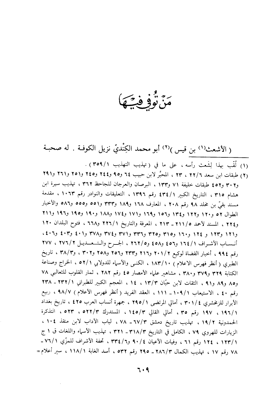 [2] طبقات ابن سعد 6/ 22، 23، المحبّر لابن حبيب 64 و 95 و 244 و 245 و 251 و 261 و 291 و 302 و 452 طبقات خليفة 71 و 133، البرصان والعرجان للجاحظ 362، تهذيب سيرة ابن هشام 315، التاريخ الكبير 1/ 434 رقم 1396، التعليقات والنوادر رقم 1063، مقدمة مسند بقيّ بن مخلد 98 رقم 208، المعارف 168 و 189 و 333 و 551 و 555 و 586 والأخبار الطوال 52 و 120 و 122 و 134 و 156 و 169 و 171 و 174 و 188 و 190 و 195 و 196 و 211 و 224، المسند لأحمد 5/ 211- 213، المعرفة والتاريخ 1/ 226 و 668، فتوح البلدان 120 و 121 و 123 و 124 و 160 و 315 و 325 و 336 و 371 و 374 و 378 و 401 و 403 و 406، أنساب الأشراف 1/ 164 و 456 و 458 و 5/ 262، الجرح والتعديل 2/ 276، 277 رقم 994، أخبار القضاة لوكيع 2/ 201 و 216 و 233 و 256 و 258 و 302، و 3/ 38، تاريخ الطبري (انظر فهرس الأعلام) 10/ 183، الكنى والأسماء للدولابي 1/ 52، الخراج وصناعة الكتابة 329 و 379 و 380، مشاهير علماء الأمصار 45 رقم 282، ثمار القلوب للثعالبي 78 و 85 و 89 و 91، الثقات لابن حبّان 3/ 13، 14، المعجم الكبير للطبراني 1/ 232- 238 رقم 40، الاستيعاب 1/ 109- 111، العقد الفريد (انظر فهرس الأعلام) 7/ 98، ربيع الأبرار للزمخشري 4/ 301، أمالي المرتضى 1/ 295، جمهرة أنساب العرب 425، تاريخ بغداد 1/ 196، 197 رقم 35، أمالي القالي 3/ 145، المستدرك 3/ 522، 523، التذكرة الحمدونية 2/ 19، تهذيب تاريخ دمشق 3/ 67- 78، لباب الآداب لابن منقذ 104، الزيارات للهروي 79، الكامل في التاريخ 3/ 318- 321، تهذيب الأسماء واللغات ق 1 ج 1/ 123، 124 رقم 61، وفيات الأعيان 4/ 90 و 6/ 334، تحفة الأشراف للمزّي 1/ 76- 78 رقم 17، تهذيب الكمال 3/ 286- 295 رقم 532، أسد الغابة 1/ 118، سير أعلام