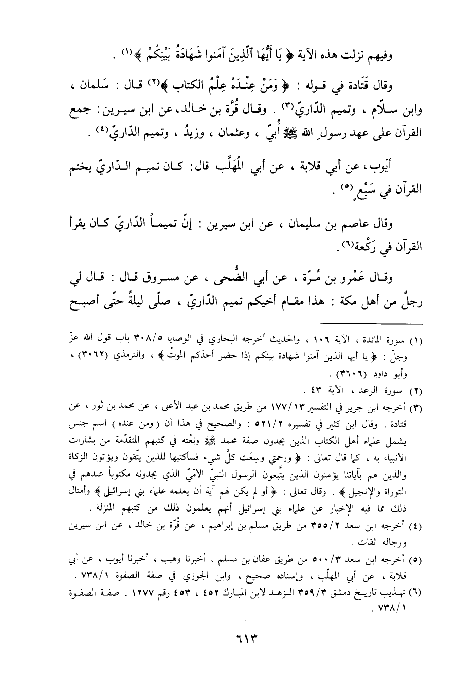 وقال قَتَادَةَ فِي قوله: وَمن عِنْدَهُ عِلْمُ الْكِتابِ 13: 43 [2] قَالَ: سَلمان، وابن سلّام، وتميم الدّاريّ [3] . وقال قُرَّةُ بْن خَالِد، عن ابن سِيرِينَ: جمع القرآن عَلَى عَهْدِ رَسُولِ اللَّهِ صَلَّى اللَّهُ عَلَيْهِ وَسَلَّمَ أُبيّ، وعثمان، وزيدُ، وتميم الدّاريّ [4] .