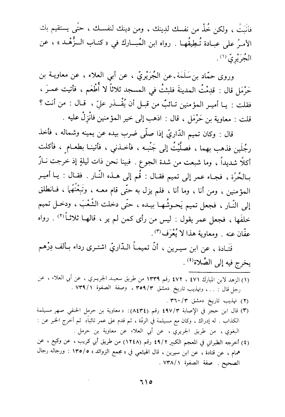 [1] الزهد لابن المبارك 471، 472 رقم 1339 من طريق سعيد الْجُرَيْرِيُّ، عَنْ أَبِي الْعَلاءِ، عَنْ رَجُلٍ قَالَ: ... ، وتهذيب تاريخ دمشق 3/ 359، وصفة الصفوة 1/ 739.