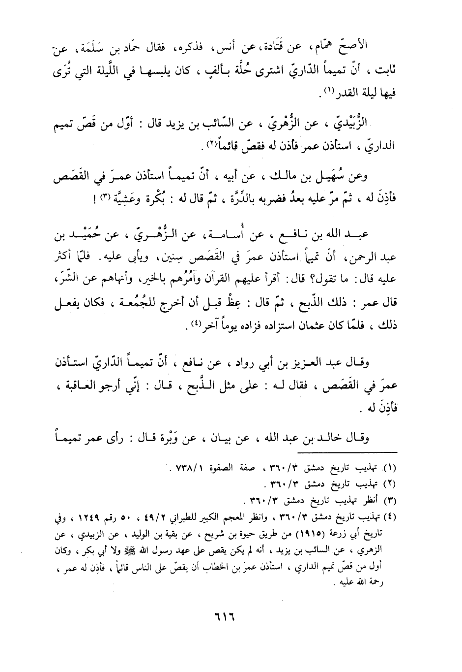 وعن سهيل بن مالك، عن أَبِيهِ، أنّ تميمًا استأذن عُمَر فِي القَصَص فأذِنَ له، ثُمَّ مر عليه بعدُ فضربه بالدِّرَّة، ثُمَّ قَالَ لَهُ: بُكْرة وعَشِيَّة [3] ! عَبْدُ اللَّهِ بْنُ نَافِعٍ، عَنْ أُسَامَةَ، عَنِ الزُّهْرِيِّ، عَنْ حُمَيْدِ بْنِ عَبْدِ الرَّحْمَنِ، أَنَّ تَمِيمًا اسْتَأْذَنَ عُمَرَ فِي الْقَصَصِ سِنِينَ، وَيَأْبَى عَلَيْهِ. فَلَمَّا أَكْثَرَ عَلَيْهِ قَالَ: مَا تَقُولُ؟ قَالَ: أَقْرَأُ عَلَيْهِمُ الْقُرْآنَ وَآمُرُهُمْ بِالْخَيْرِ، وَأَنْهَاهُمْ عَنِ الشَّرِّ، قَالَ عُمَرُ: ذَلِكَ الذَّبْحُ، ثُمَّ قَالَ: عِظْ قَبْلَ أَنْ أَخْرُجَ لِلْجُمُعَةِ، فَكَانَ يَفْعَلُ ذَلِكَ، فَلَمَّا كَانَ عُثْمَانُ اسْتَزَادَهُ فَزَادَهُ يَوْمًا آخَرَ [4] .