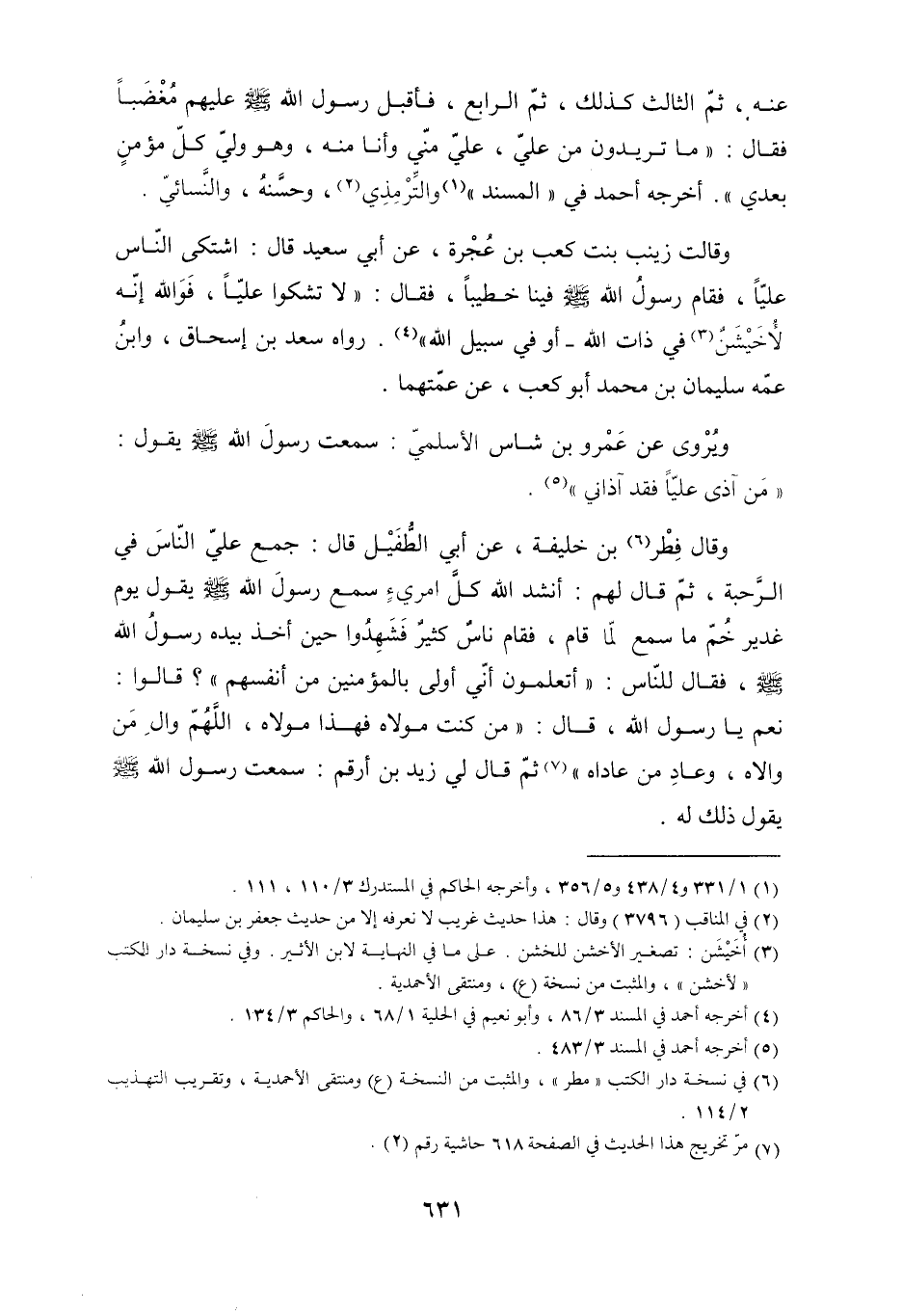 عنه، ثمّ الثالث كذلك، ثُمَّ الرَّابِعُ، فَأَقْبَلَ رَسُولُ اللَّهِ صَلَّى اللَّهُ عَلَيْهِ وَسَلَّمَ عَلَيْهِمْ مُغْضَبًا فَقَالَ: «مَا تُرِيدُونَ مِنْ عَلِيٍّ، عَلِيٌّ مِنِّي وَأَنَا مِنْهُ، وَهُوَ وَلِيُّ كُلِّ مُؤْمِنٍ بَعْدِي» . أَخْرَجَهُ أَحْمَدُ فِي «الْمُسْنَدِ» [1] وَالتِّرْمِذِيُّ [2] ، وَحَسَّنَهُ، وَالنَّسَائِيُّ. وَقَالَتْ زَيْنَبُ بِنْتُ كَعْبِ بْنِ عُجْرَةَ، عَنْ أَبِي سَعِيدٍ قَالَ: اشْتَكَى النَّاسُ عَلِيًّا، فَقَامَ رَسُولُ اللَّهِ صَلَّى اللَّهُ عَلَيْهِ وَسَلَّمَ فينا خطيبا، فقال: «لا تشكوا عليّا، فو الله إِنَّهُ لَأُخَيْشَنٌ [3] فِي ذَاتِ اللَّهِ- أَوْ فِي سبيل الله» [4] . رواه سَعْدُ بْنُ إِسْحَاقَ، وَابْنُ عَمِّهِ سُلَيْمَانُ بْنُ محمد أبو كَعْبٍ، عَنْ عَمَّتِهِمَا. وَيُرْوَى عَنْ عَمْرِو بْنِ شَاسٍ الْأَسْلَمِيِّ: سَمِعْتُ رَسُولَ اللَّهِ صَلَّى اللَّهُ عَلَيْهِ وَسَلَّمَ يَقُولُ: «مَنْ آذَى عَلِيًّا فَقَدْ آذَانِي» [5] . وَقَالَ فِطْرُ [6] بْنُ خَلِيفَةَ، عَنْ أَبِي الطُّفَيْلِ قَالَ: جَمَعَ عَلِيٌّ النَّاسَ فِي الرَّحْبَةِ، ثُمَّ قَالَ لَهُمْ: أَنْشُدُ اللَّهَ كُلَّ امْرِئٍ سَمِعَ رَسُولَ اللَّهِ صَلَّى اللَّهُ عَلَيْهِ وَسَلَّمَ يَقُولُ يَوْمَ غَدِيرِ خُمٍّ مَا سَمِعَ لَمَّا قَامَ، فَقَامَ نَاسٌ كَثِيرٌ فَشَهِدُوا حِينَ أَخَذَ بِيَدِهِ رَسُولُ اللَّهِ صَلَّى اللَّهُ عَلَيْهِ وَسَلَّمَ، فَقَالَ لِلنَّاسِ: «أَتَعْلَمُونَ أَنِّي أَوْلَى بِالْمُؤْمِنِينَ مِنْ أَنْفُسِهِمْ» ؟ قَالُوا:
