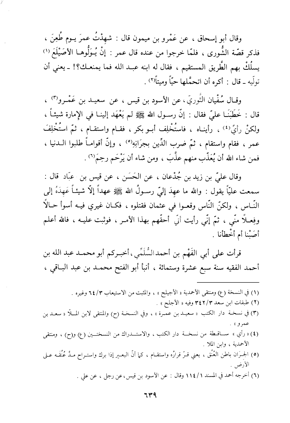 سَمِعْتُ عَلِيًّا يَقُولُ: وَاللَّهِ مَا عَهِدَ إِلَيَّ رَسُولُ اللَّهِ صَلَّى اللَّهُ عَلَيْهِ وَسَلَّمَ عَهْدًا إِلا شَيْئًا عَهِدَهُ إِلَى النَّاسِ، وَلَكِنَّ النَّاسُ وَقَعُوا فِي عُثْمَانَ فَقَتَلُوهُ، فَكَانَ غَيْرِي فِيهِ أَسْوَأَ حَالا وَفِعْلا مِنِّي، ثُمَّ إِنِّي رَأَيْتُ أَنِّي أَحَقُّهُمْ بِهَذَا الأَمْرِ، فَوَثَبْتُ عَلَيْهِ، فاللَّه أَعْلَمُ أَصَبْنَا أمُّ أَخْطَأْنَا. قَرَأتُ عَلَى أَبِي الْفَهْمِ بْنِ أَحْمَدَ السُّلَمِيِّ، أَخْبَرَكُمْ أَبُو مُحَمَّدٍ عَبْدُ اللَّهِ بْنُ أَحْمَدَ الْفَقِيهُ سَنَةَ سَبْعَ عَشْرَةَ وَسِتِّمِائَةٍ، أَنْبَأَ أَبُو الْفَتْحِ مُحَمَّدُ بن عبد الباقي،