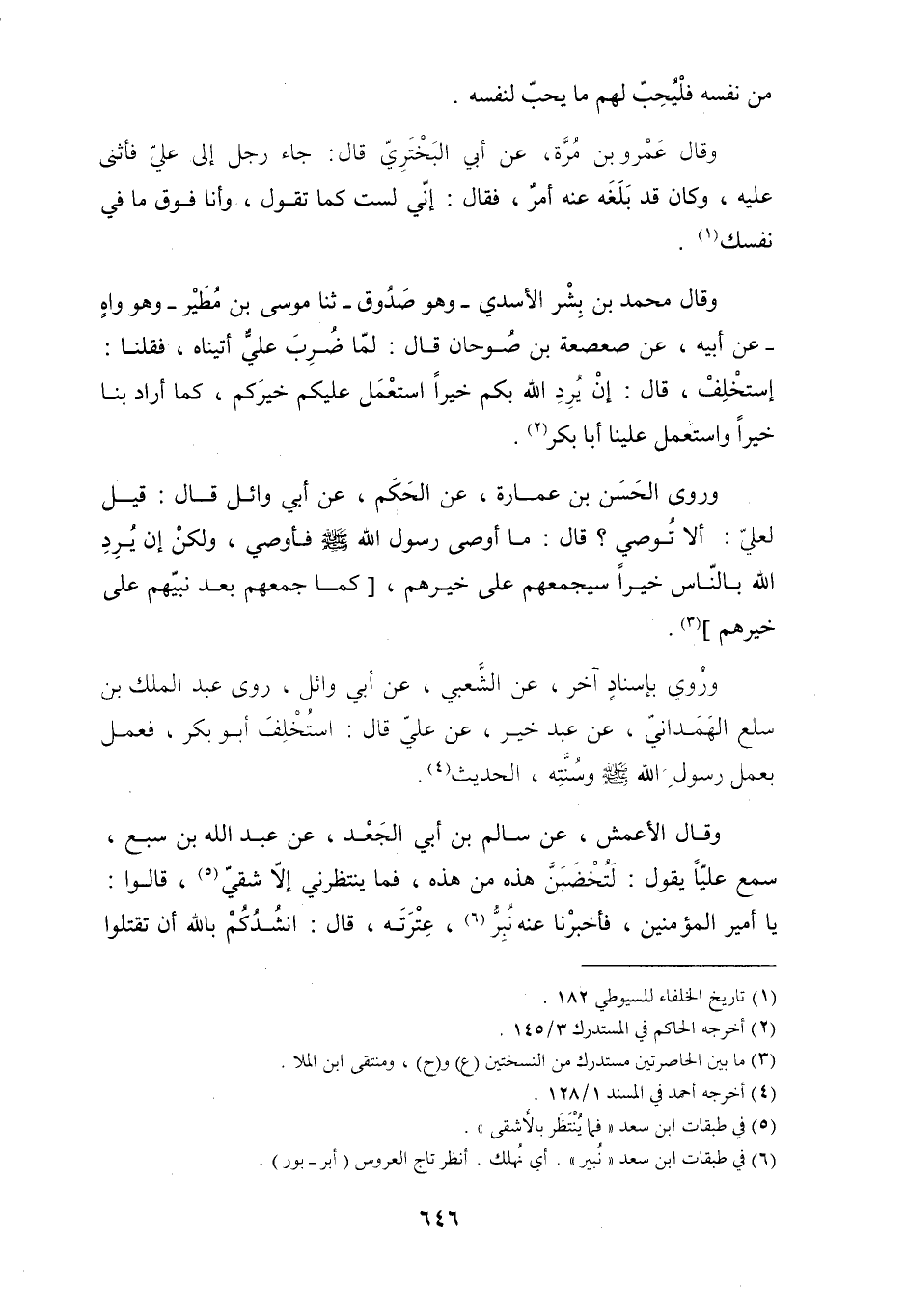 اسْتَخْلِفْ، قَالَ: إِنْ يُرِدِ اللَّهُ بِكُمْ خَيْرًا اسْتَعْمَلَ عَلَيْكُمْ خَيْرَكُمْ، كَمَا أَرَادَ بِنَا خَيْرًا وَاسْتَعْمَلَ عَلَيْنَا أَبَا بَكْرٍ [2] . وَرَوَى الْحَسَنُ بْنُ عُمَارَةَ، عَنِ الْحَكَمِ، عَنْ أَبِي وَائِلٍ قَالَ: قِيلَ لِعَلِيٍّ: أَلَا تُوصِي؟ قَالَ: مَا أَوْصَى رَسُولُ اللَّهِ صَلَّى اللَّهُ عَلَيْهِ وَسَلَّمَ فَأَوْصَى، وَلَكِنْ إِنْ يرد الله بالنّاس خيرا سيجمعهم على خيرهم، [كَمَا جَمَعَهُمْ بَعْدَ نَبِيِّهِمْ عَلَى خَيْرِهِمْ] [3] . وَرُوِيَ بِإِسْنَادٍ آخَرَ، عَنِ الشَّعْبِيِّ، عَنْ أَبِي وَائِلٍ، رَوَى عَبْدُ الْمَلِكِ بْنُ سَلْعٍ الْهَمَدَانِيُّ، عَنْ عَبْدِ خَيْرٍ، عَنْ عَلِيٍّ قَالَ: استُخْلِفَ أَبُو بَكْرٍ، فَعَمِلَ بِعَمَلِ رَسُولِ اللَّهِ صَلَّى اللَّهُ عَلَيْهِ وَسَلَّمَ وسُنَّتِه، الْحَدِيثَ [4] .