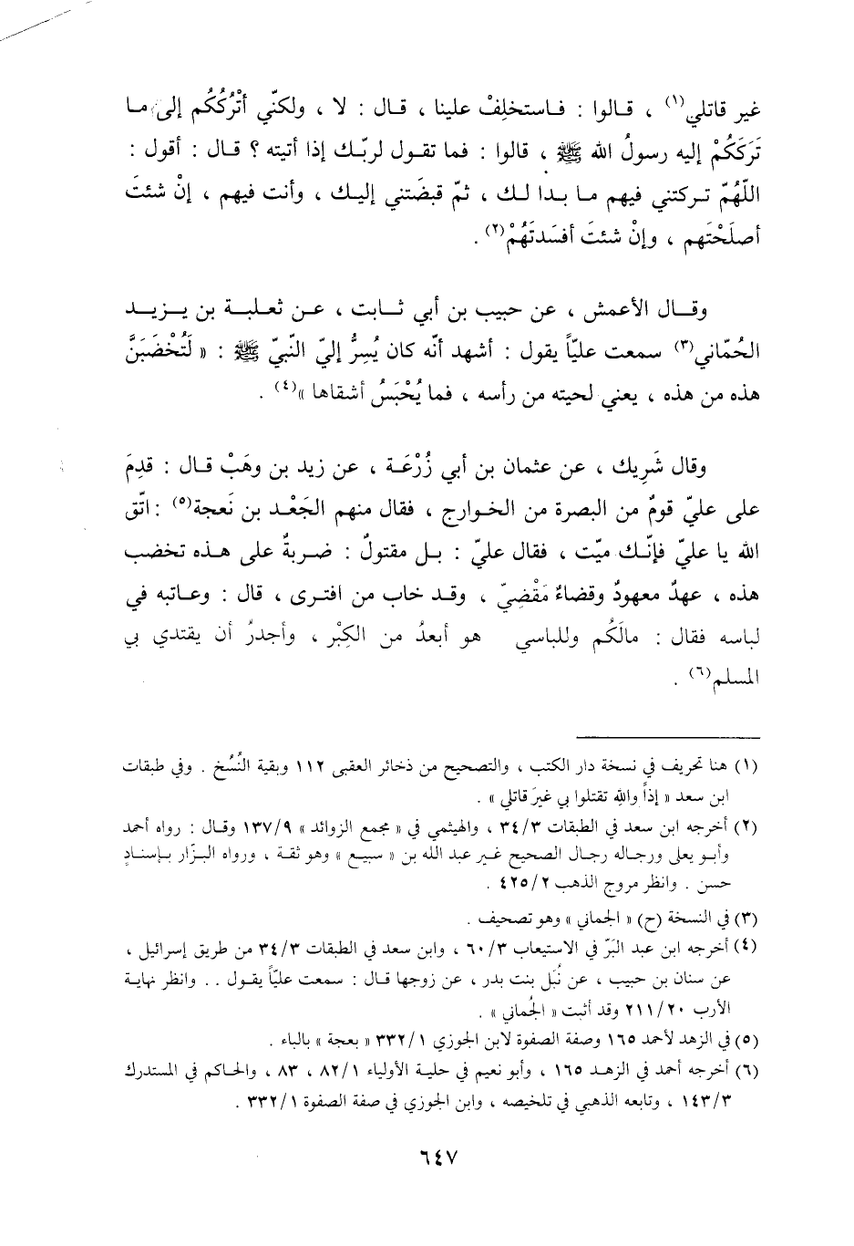 [2] أخرجه ابن سعد في الطبقات 3/ 34، والهيثمي في «مجمع الزوائد» 9/ 137 وقال: رواه أحمد وأبو يعلى ورجاله رجال الصحيح غير عبد الله بن «سبيع» وهو ثقة، ورواه البزّار بإسناد حسن. وانظر مروج الذهب 2/ 425.