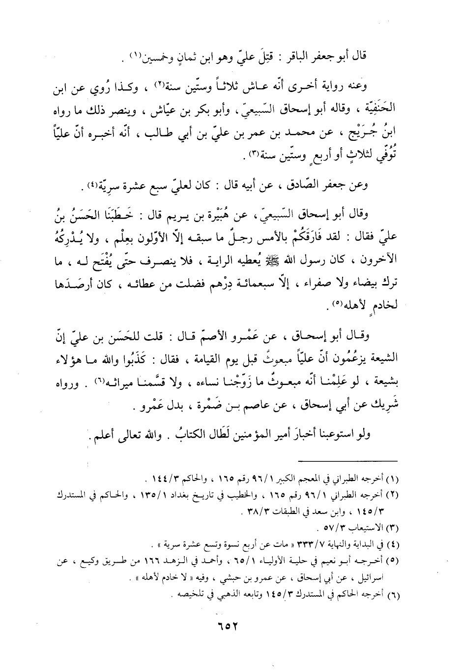وعن جَعْفَر الصادق، عن أَبِيهِ قَالَ: كان لعليّ سبع عشرة سرِيّة [4] . وَقَالَ أَبُو إِسْحَاقَ السَّبِيعِيُّ، عَنْ هُبَيْرَةَ بْنِ يَرِيمَ قَالَ: خَطَبَنَا الْحَسَنُ بْنُ عَلِيٍّ فَقَالَ: لَقَدْ فَارَقَكُمْ بِالأَمْسِ رَجُلٌ مَا سَبَقَهُ إِلا الأَوَّلُونَ بِعِلْمٍ، وَلا يُدْرِكُهُ الآخِرُونَ، كَانَ رَسُولُ اللَّهِ صَلَّى اللَّهُ عَلَيْهِ وَسَلَّمَ يُعْطِيهِ الرَّايَةَ، فَلا يَنْصَرِفُ حَتَّى يُفْتَحَ لَهُ، مَا تَرَكَ بَيْضَاءَ وَلا صَفْرَاءَ، إِلا سَبْعَمِائَةِ دِرْهَمٍ فَضَلَتْ مِنْ عَطَائِهِ، كَانَ أَرْصَدَهَا لِخَادِمٍ لأَهْلِهِ [5] . وَقَالَ أَبُو إِسْحَاقَ، عَنْ عَمْرٍو الأَصَمِّ قَالَ: قُلْتُ لِلْحَسَنِ بْنِ عَلِيٍّ إِنَّ الشِّيعَةَ يَزْعُمُونَ أَنَّ عَلِيًّا مَبْعُوثٌ قَبْلَ يَوْمِ الْقِيَامَةِ، فَقَالَ: كَذَبُوا وَاللَّهِ مَا هَؤُلاءِ بِشِيعَةٍ، لَوْ عَلِمْنَا أَنَّهُ مَبْعُوثٌ مَا زَوَّجْنَا نِسَاءَهُ، وَلا قَسَّمْنَا مِيرَاثَهُ [6] . وَرَوَاهُ شَرِيكٌ عَنْ أَبِي إِسْحَاقَ، عَنْ عَاصِمِ بْنِ ضَمْرَةَ، بَدَلَ عَمْرٍو. ولو استوعبنا أخبار أمير المؤمنين لَطَالَ الكتاب. والله تعالى أعلم.