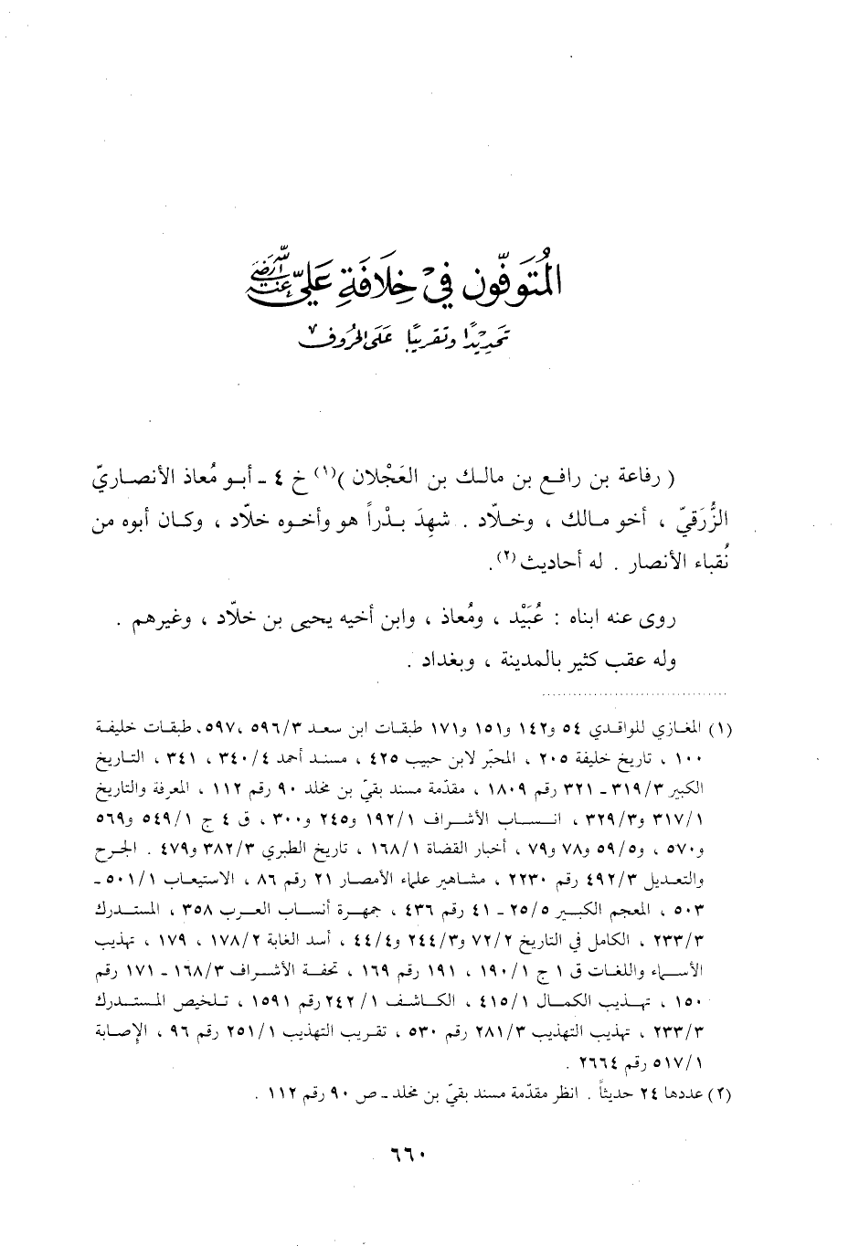 [1] المغازي للواقدي 54 و 142 و 151 و 171 طبقات ابن سعد 3/ 596، 597، طبقات خليفة 100، تاريخ خليفة 205، المحبّر لابن حبيب 425، مسند أحمد 4/ 340، 341، التاريخ الكبير 3/ 319- 321 رقم 1809، مقدّمة مسند بقيّ بن مخلد 90 رقم 112، المعرفة والتاريخ 1/ 317 و 3/ 329، أنساب الأشراف 1/ 192 و 245 و 300، ق 4 ج 1/ 549 و 569 و 570، و 5/ 59 و 78 و 79، أخبار القضاة 1/ 168، تاريخ الطبري 3/ 382 و 479. الجرح والتعديل 3/ 492 رقم 2230، مشاهير علماء الأمصار 21 رقم 86، الاستيعاب 1/ 501- 503، المعجم الكبير 5/ 25- 41 رقم 436، جمهرة أنساب العرب 358، المستدرك 3/ 233، الكامل في التاريخ 2/ 72 و 3/ 244 و 4/ 44، أسد الغابة 2/ 178، 179، تهذيب الأسماء واللغات ق 1 ج 1/ 190، 191 رقم 169، تحفة الأشراف 3/ 168- 171 رقم 150، تهذيب الكمال 1/ 415، الكاشف 1/ 242 رقم 1591، تلخيص المستدرك 3/ 233، تهذيب التهذيب 3/ 281 رقم 530، تقريب التهذيب 1/ 251 رقم 96، الإصابة 1/ 517 رقم 2664.