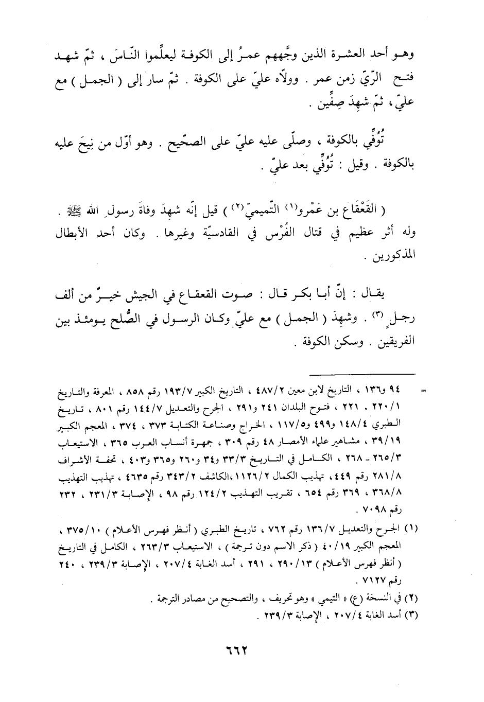[1] الجرح والتعديل 7/ 136 رقم 762، تاريخ الطبري (انظر فهرس الأعلام) 10/ 375، المعجم الكبير 19/ 40 (ذكر الاسم دون ترجمة) ، الاستيعاب 3/ 263، الكامل في التاريخ (انظر فهرس الأعلام) 13/ 290، 291، أسد الغابة 4/ 207، الإصابة 3/ 239، 240 رقم 7127.