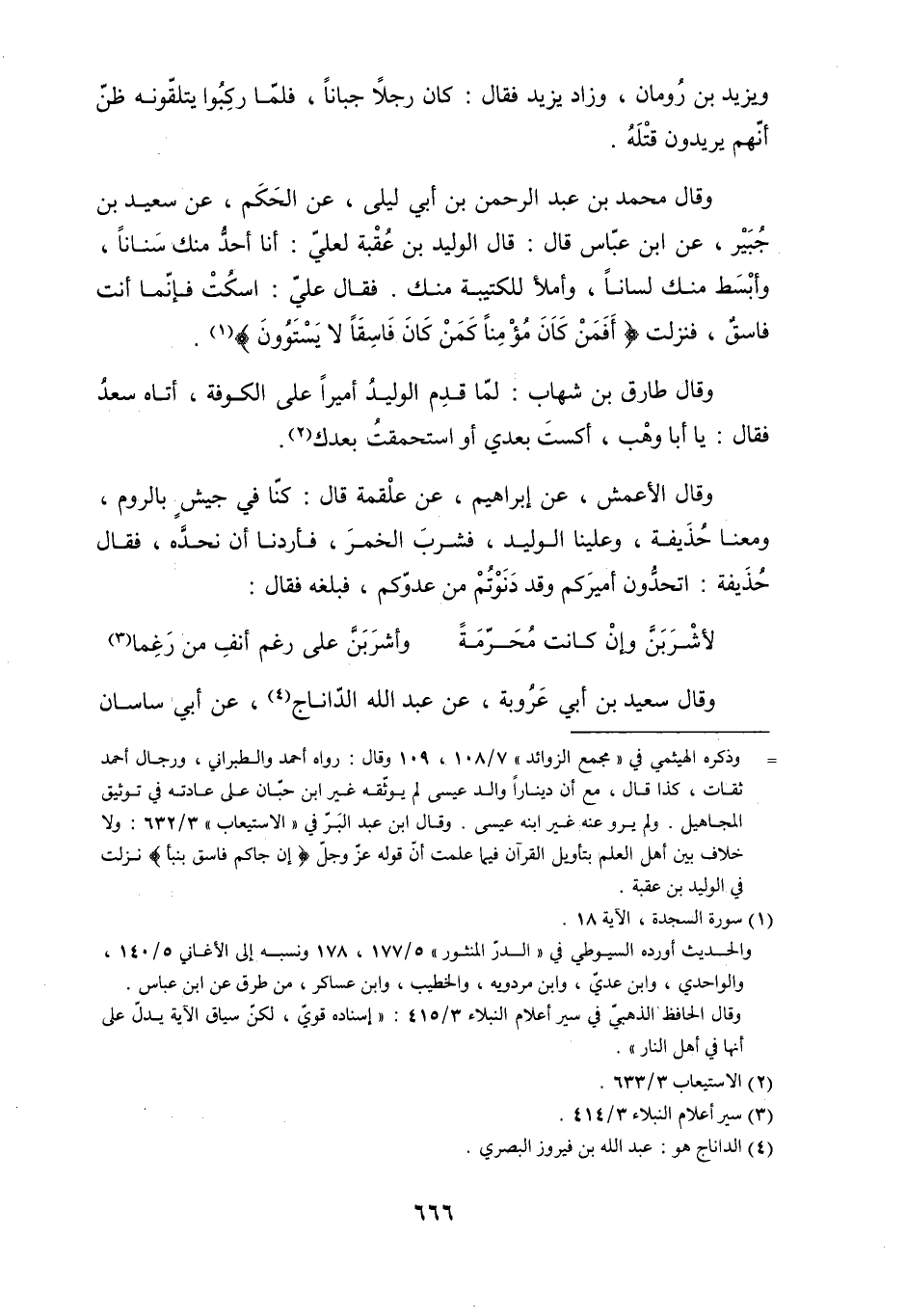 [ () ] وذكره الهيثمي في «مجمع الزوائد» 7/ 108، 109 وقال: رواه أحمد والطبراني، ورجال أحمد ثقات، كذا قال، مع أن دينارا والد عيسى لم يوثّقه غير ابن حبّان على عادته في توثيق المجاهيل. ولم يرو عنه غير ابنه عيسى. وقال ابن عبد البرّ في «الاستيعاب» 3/ 632: ولا خلاف بين أهل العلم بتأويل القرآن فيما علمت أنّ قوله عزّ وجلّ إِنْ جاءَكُمْ فاسِقٌ بِنَبَإٍ 49: 6 نزلت في الوليد بن عقبة.