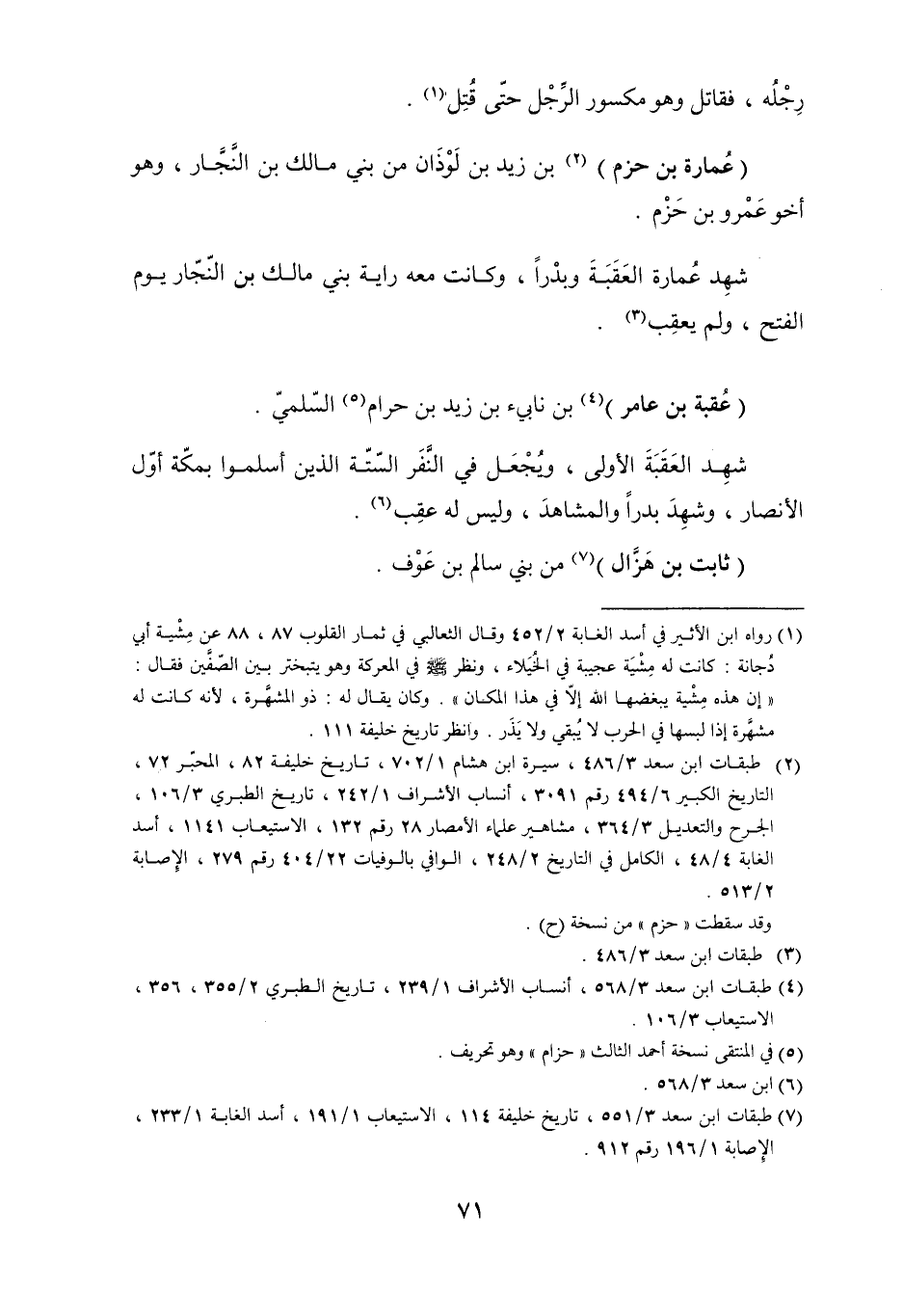 [7] طبقات ابن سعد 3/ 551، تاريخ خليفة 114، الاستيعاب 1/ 191، أسد الغابة 1/ 233، الإصابة 1/ 196 رقم 912.