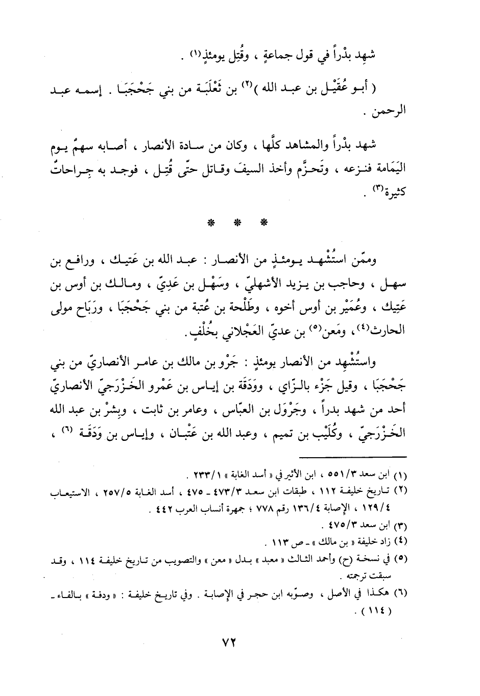 [2] تاريخ خليفة 112، طبقات ابن سعد 3/ 473- 475، أسد الغابة 5/ 257، الاستيعاب 4/ 129، الإصابة 4/ 136 رقم 778، جمهرة أنساب العرب 442.