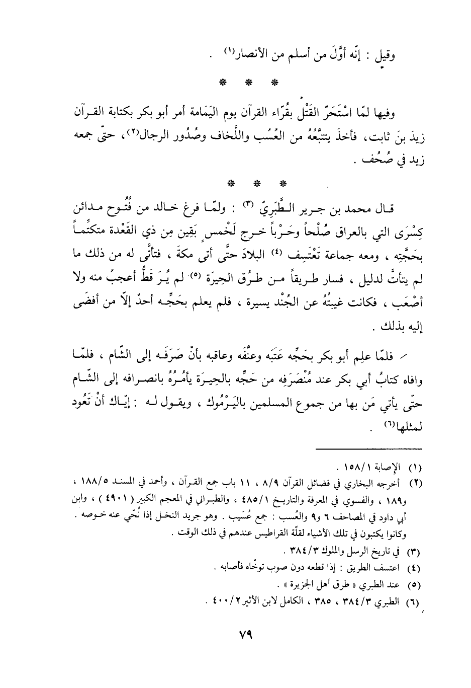 وَفِيهَا لَمَّا اسْتَحَرَّ الْقَتْلُ بِقُرَّاءِ الْقُرْآنِ يَوْمَ الْيَمَامَةِ أَمَرَ أَبُو بَكْرٍ بِكِتَابَةِ الْقُرْآنَ زَيْدَ بْنَ ثَابِتٍ، فَأَخَذَ يَتَتَبَّعُهُ مِنَ الْعُسُبِ وَاللَّخَافِ وَصُدُورِ الرِّجَالِ [2] ، حَتَّى جَمَعَهُ زَيْدٌ فِي صُحُفٍ.