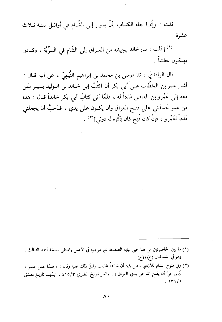 قُلْتُ: وَإِنَّمَا جَاءَ الْكِتَابُ بِأَنْ يَسِيرَ إِلَى الشَّامِ فِي أَوَائِلِ سَنَةِ ثَلَاثَ عَشْرَةَ.