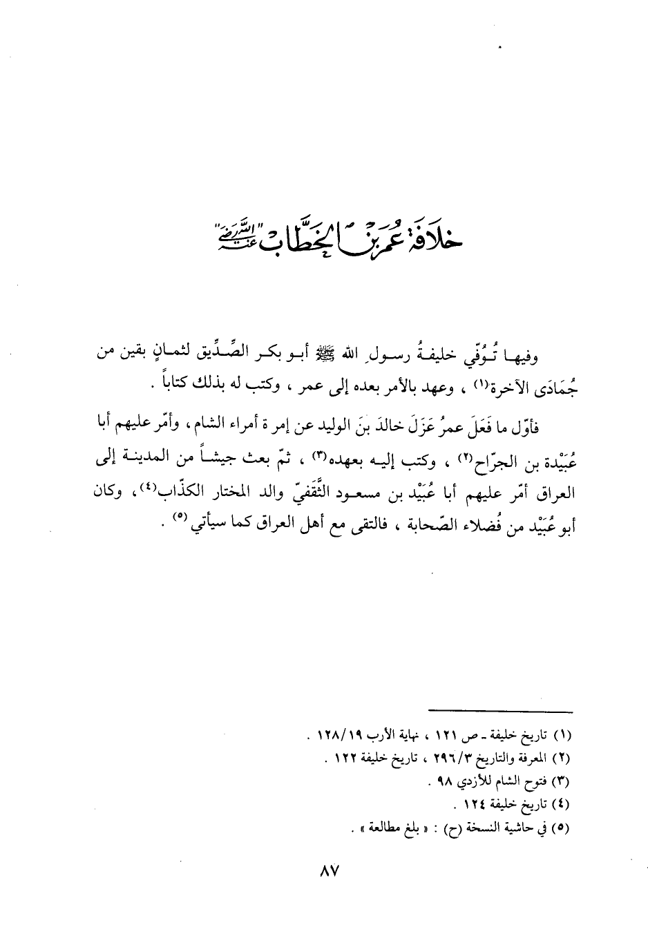 فَأَوَّلُ مَا فَعَلَ عُمَرُ عَزَلَ خَالِدَ بْنَ الْوَلِيدِ عَنْ إِمْرَةِ أُمَرَاءِ الشَّامِ، وَأَمَّرَ عَلَيْهِمْ أَبَا عُبَيْدَةَ بْنَ الْجَرَّاحِ [2] ، وَكَتَبَ إِلَيْهِ بِعَهْدِهِ [3] ، ثُمَّ بَعَثَ جَيْشًا مِنَ الْمَدِينَةِ إِلَى الْعِرَاقِ أَمَّرَ عَلَيْهِمْ أَبَا عُبَيْدِ بْنَ مَسْعُودٍ الثَّقَفِيَّ وَالِدَ الْمُخْتَارِ الْكَذَّابِ [4] ، وَكَانَ أَبُو عُبَيْدٍ مِنْ فُضَلَاءِ الصَّحَابَةِ، فالتقى مع أهل العراق كما سيأتي [5] .