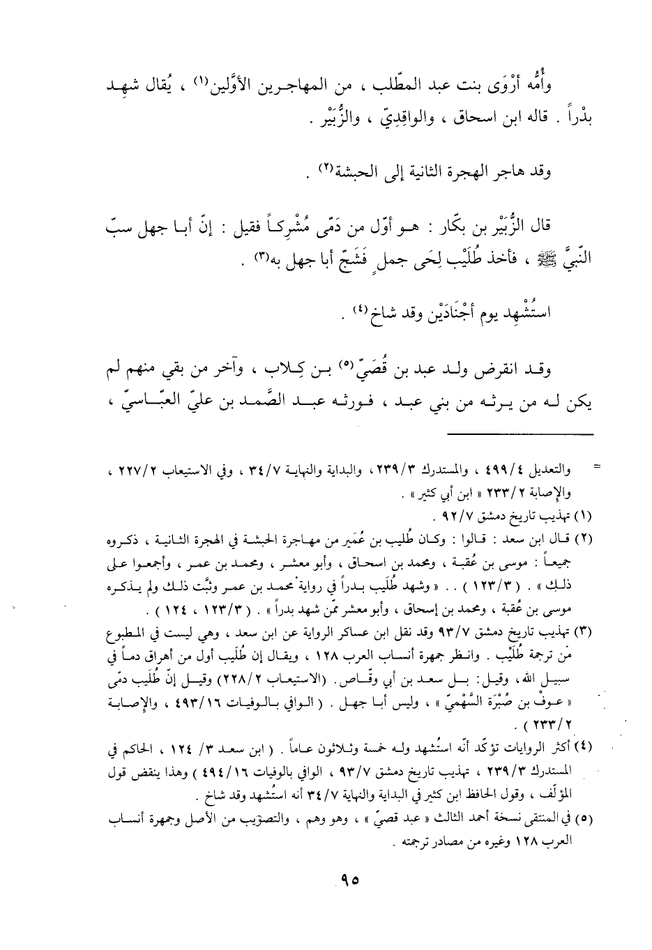 [3] تهذيب تاريخ دمشق 7/ 93 وقد نقل ابن عساكر الرواية عن ابن سعد، وهي ليست في المطبوع من ترجمة طليب. وانظر جمهرة أنساب العرب 128، ويقال إن طليب أول من أهراق دما في سبيل الله، وقيل: بل سعد بن أبي وقّاص. (الاستيعاب 2/ 228) وقيل إنّ طليب دمّى «عوف بن صبرة السّهميّ» ، وليس أبا جهل. (الوافي بالوفيات 16/ 493، والإصابة 2/ 233) .